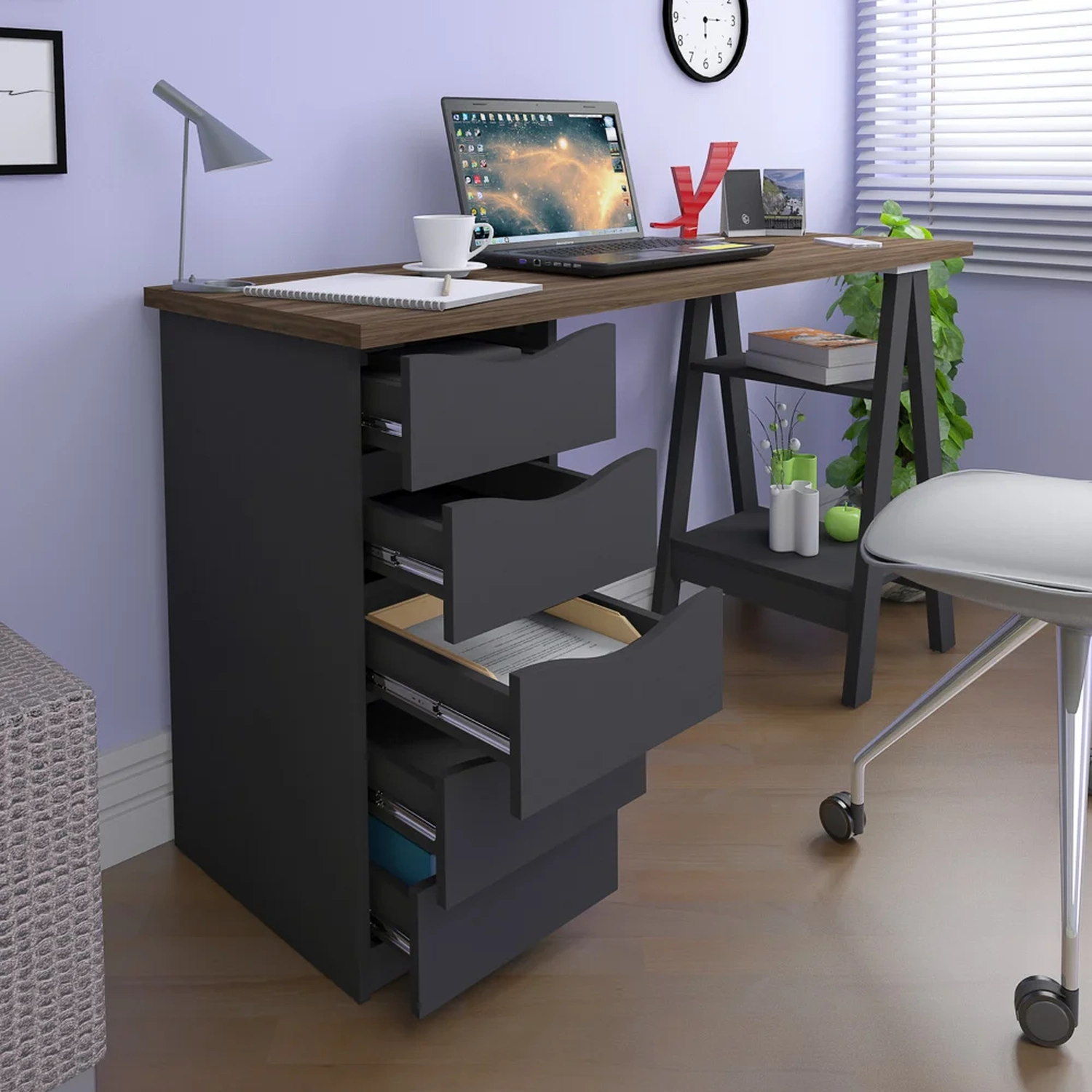 Criatividade e versatilidade são as palavras que definem a Escrivaninha Spirit Preto/Nogal, da Linha Mobile desenvolvida pela Artany. A combinação dos pés cavalete de um lado e das 5 gavetas com corrediças metálicas do outro, ambos apoiando o tampo é o que faz essa peça original e criativa.