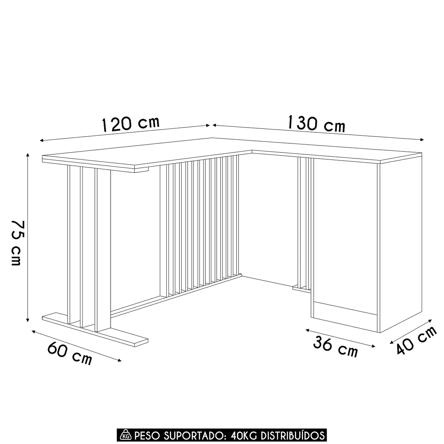 Peso Suportado Distribuído: 40 kg distribuídos.