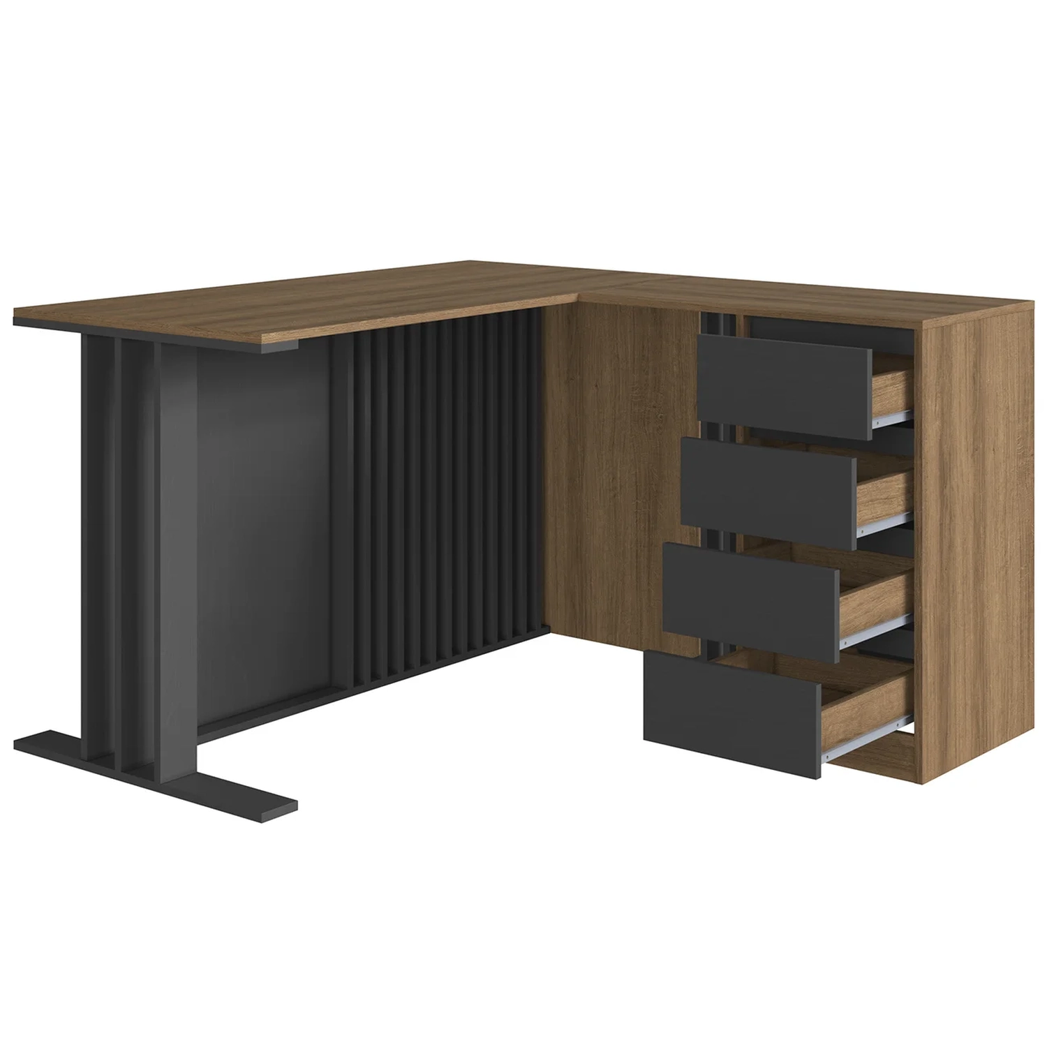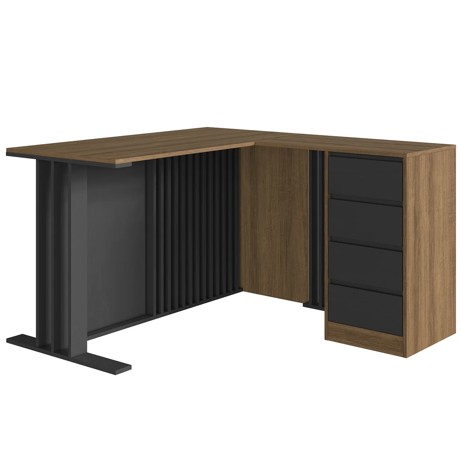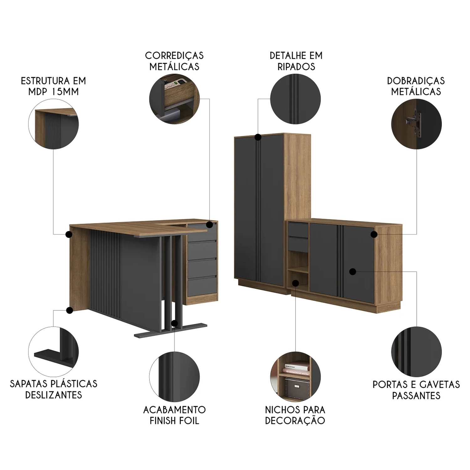 A Escrivaninha em L oferece conforto e aproveitamento de espaço, com quatro gavetas com corrediças metálicas. O Armário Alto possui portas com dobradiças metálicas e prateleiras internas para manter tudo organizado.