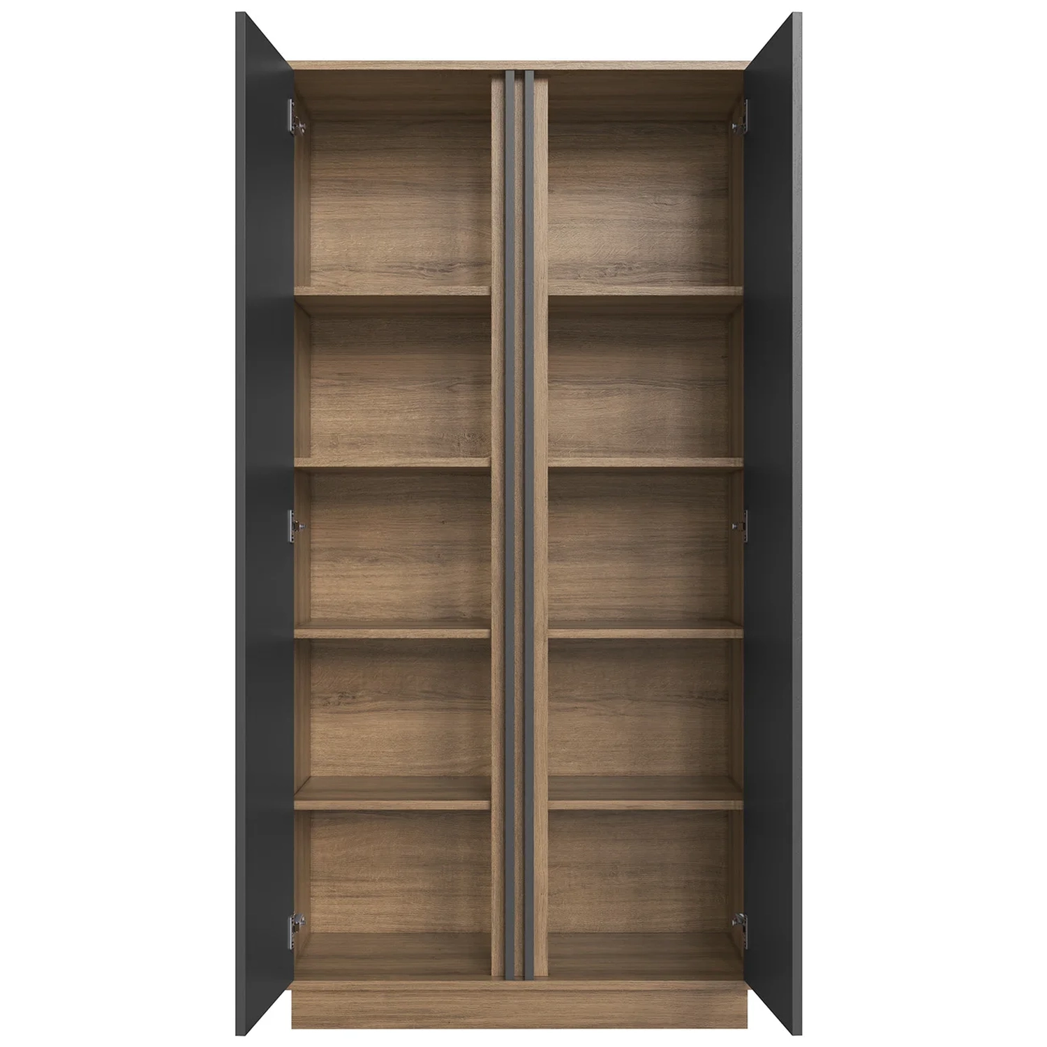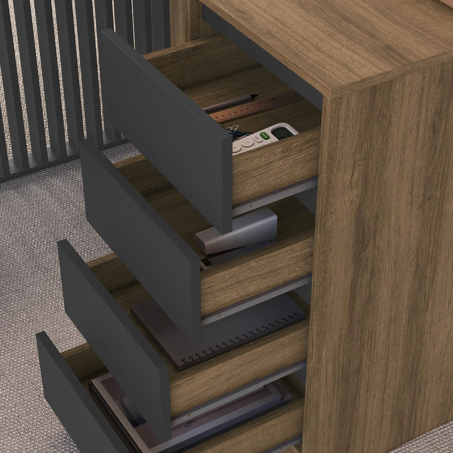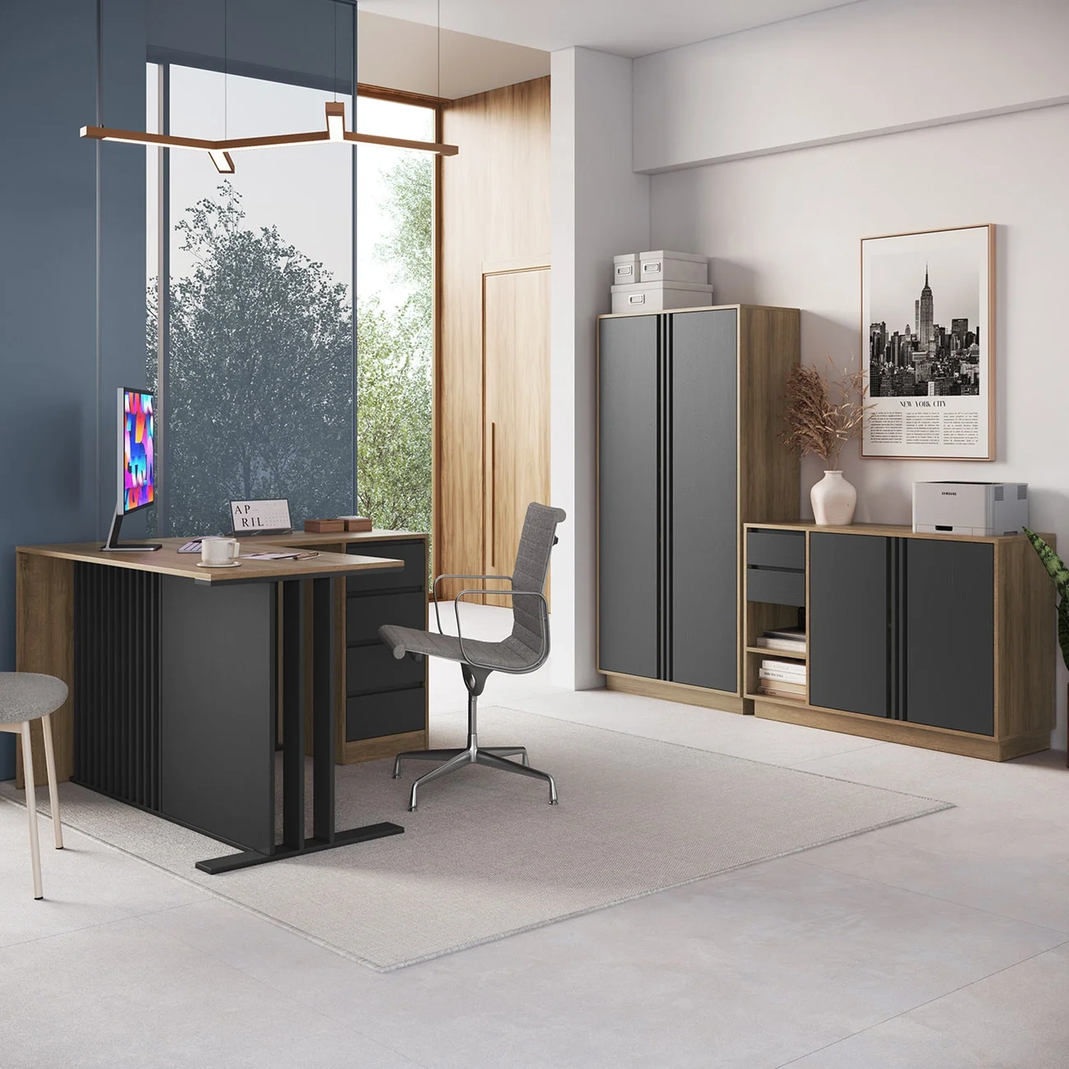 A Escrivaninha em L oferece conforto e aproveitamento de espaço, com quatro gavetas com corrediças metálicas. O Armário Alto possui portas com dobradiças metálicas e prateleiras internas para manter tudo organizado.
