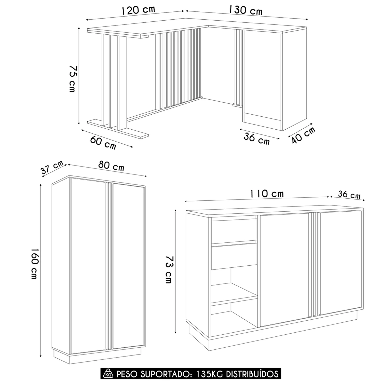 Pesos Suportados Distribuídos: Escrivaninha 40kg/ Armário 55kg/ Balcão 40kg.