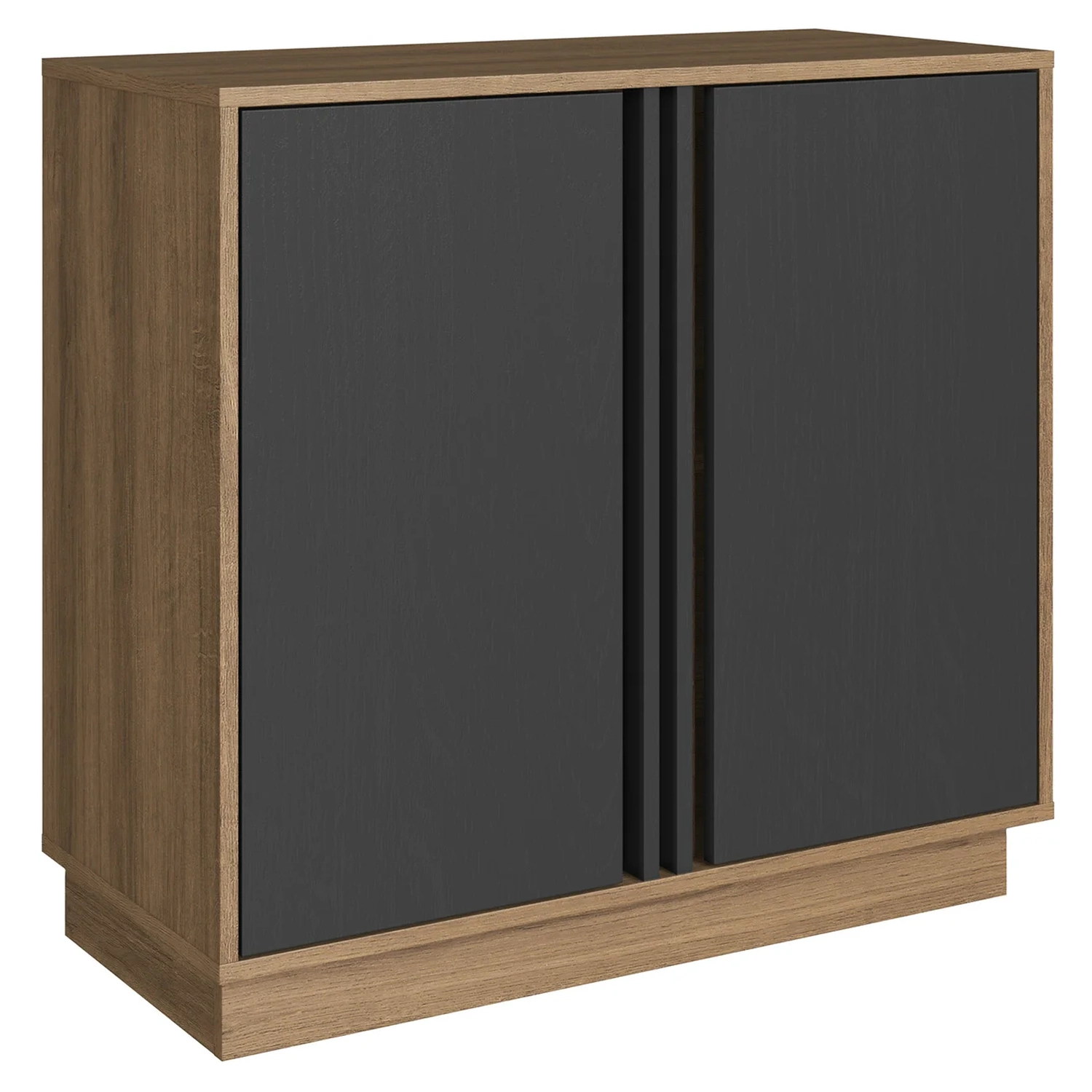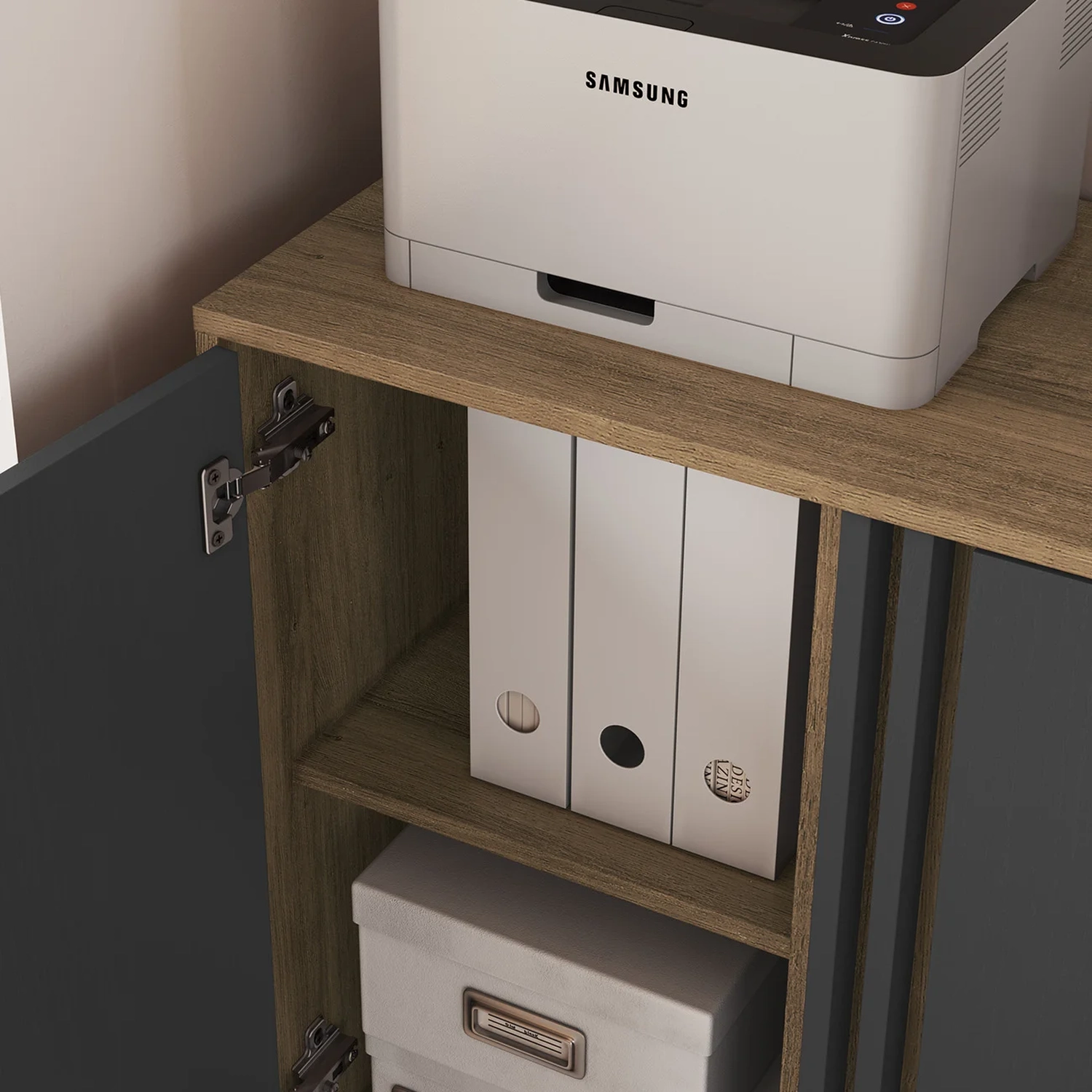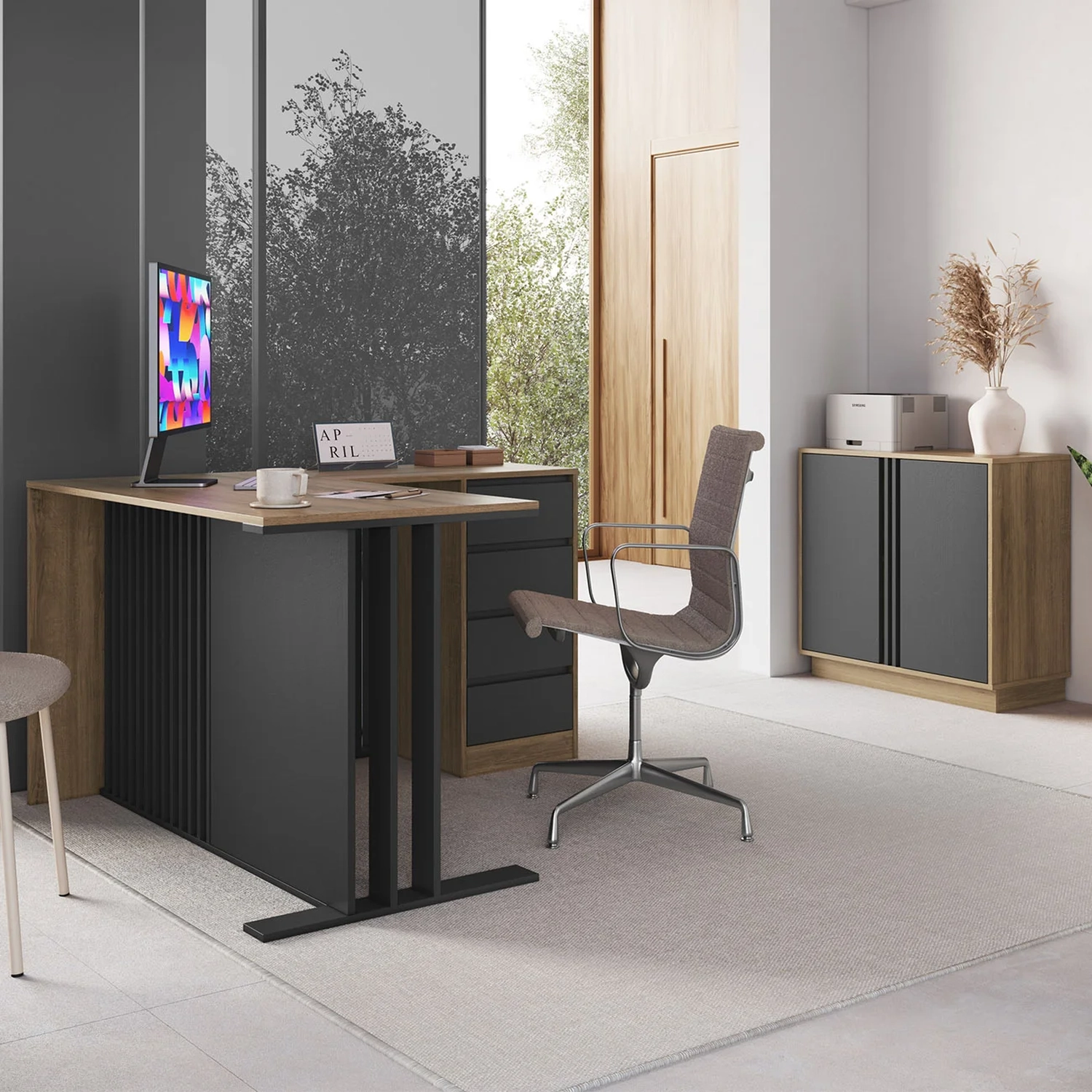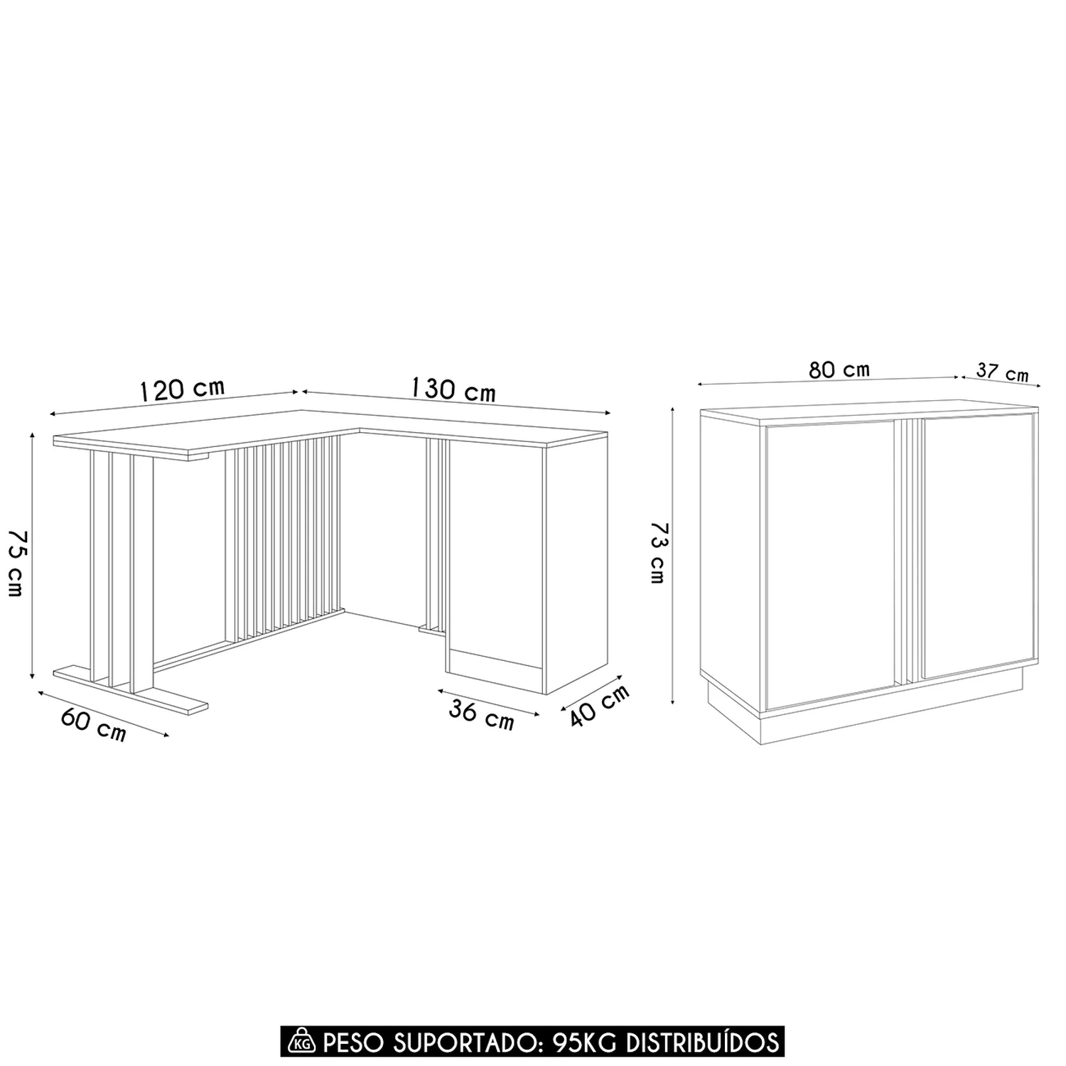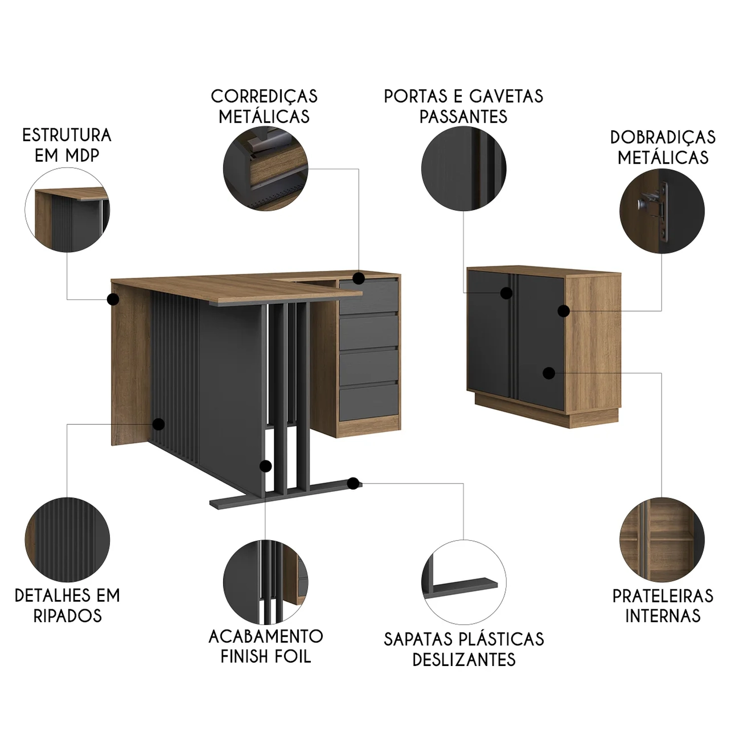 O Balcão de Escritório possui duas portas com dobradiças metálicas e prateleiras internas espaçosas, oferecendo amplo espaço para organização. Tanto o balcão quanto a mesa apresentam detalhes ripados e portas e gavetas passantes, que conferem harmonia e estilo ao design dos móveis.