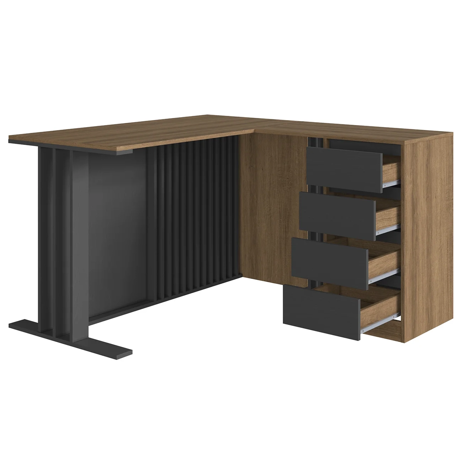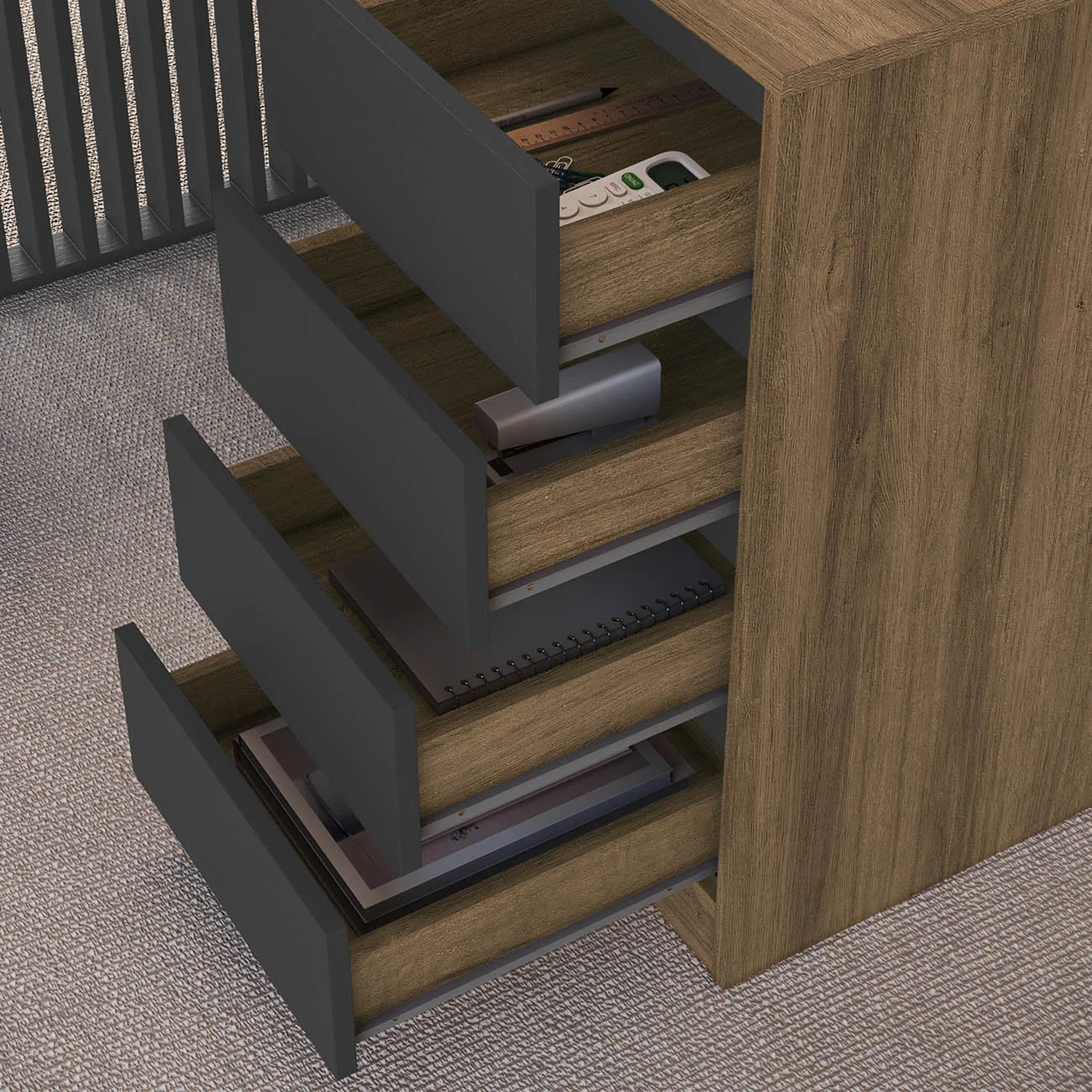A Escrivaninha em L oferece excelente aproveitamento do espaço e conta com quatro gavetas com corrediças metálicas, garantindo fácil acesso e organização para documentos e itens pessoais.
