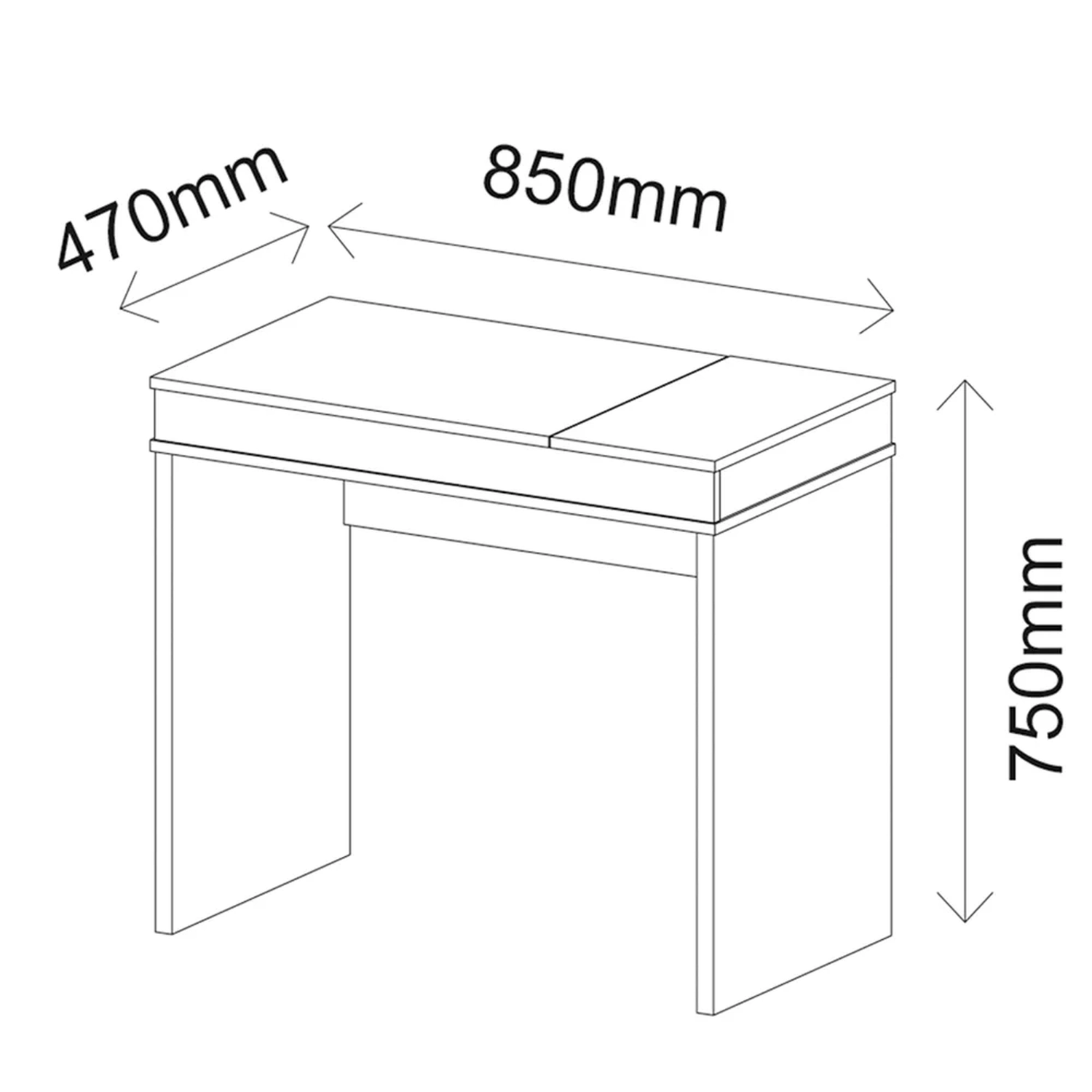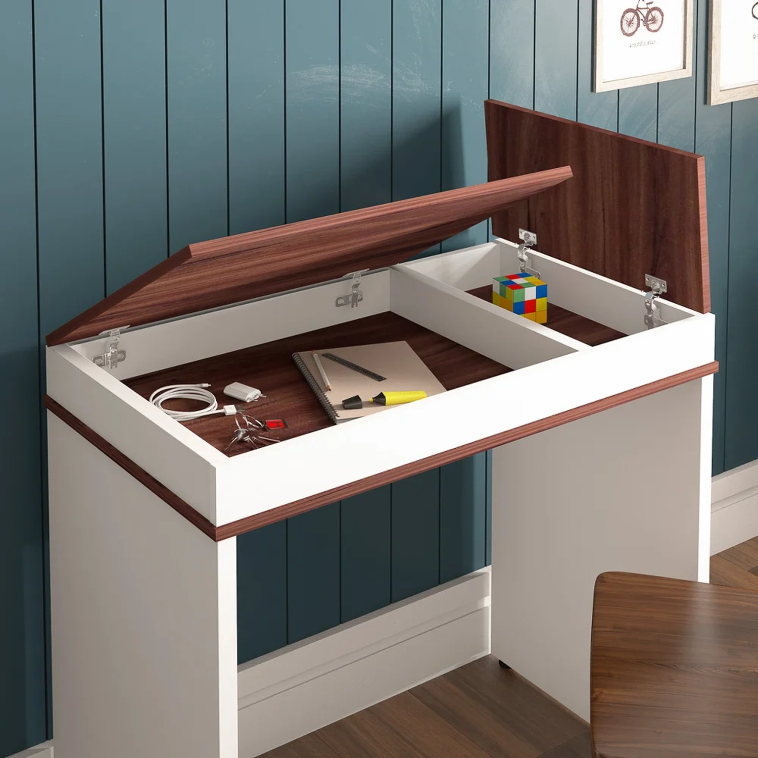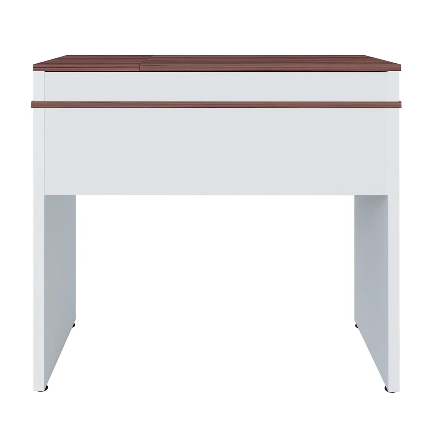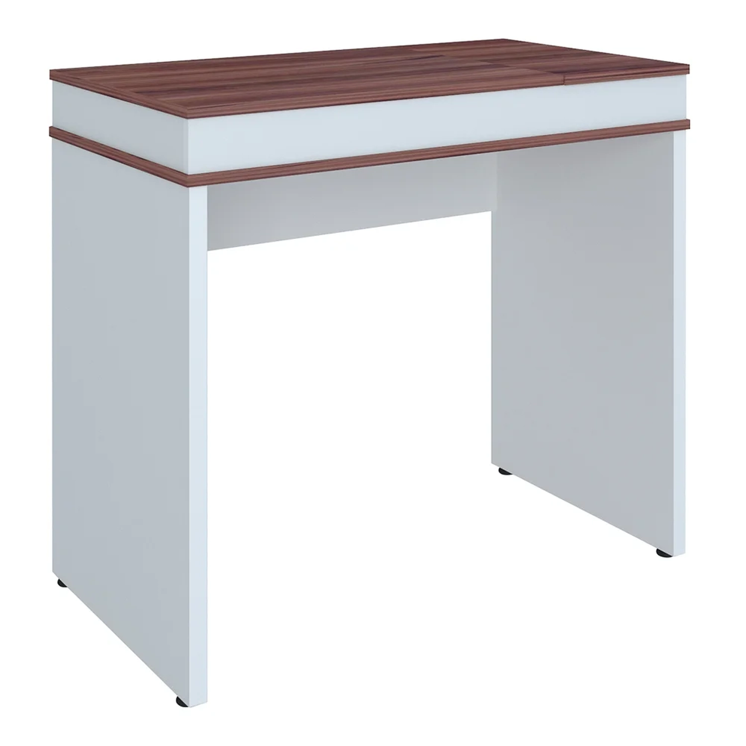 Bom, a Escrivaninha Mind tem um design diferente, pois a parte superior abre transformando-se em 2 tampos dobráveis: o maior que abre para cima e o menor abre para o lado. Além disso, embaixo de ambos você vai encontrar dois compartimentos internos para guardar seus objetos pessoais. Outro detalhe é que essa peça é bastante funcional e compacta e, por isso, você colocar esse móvel para compor a decoração da sala, quarto ou escritório.