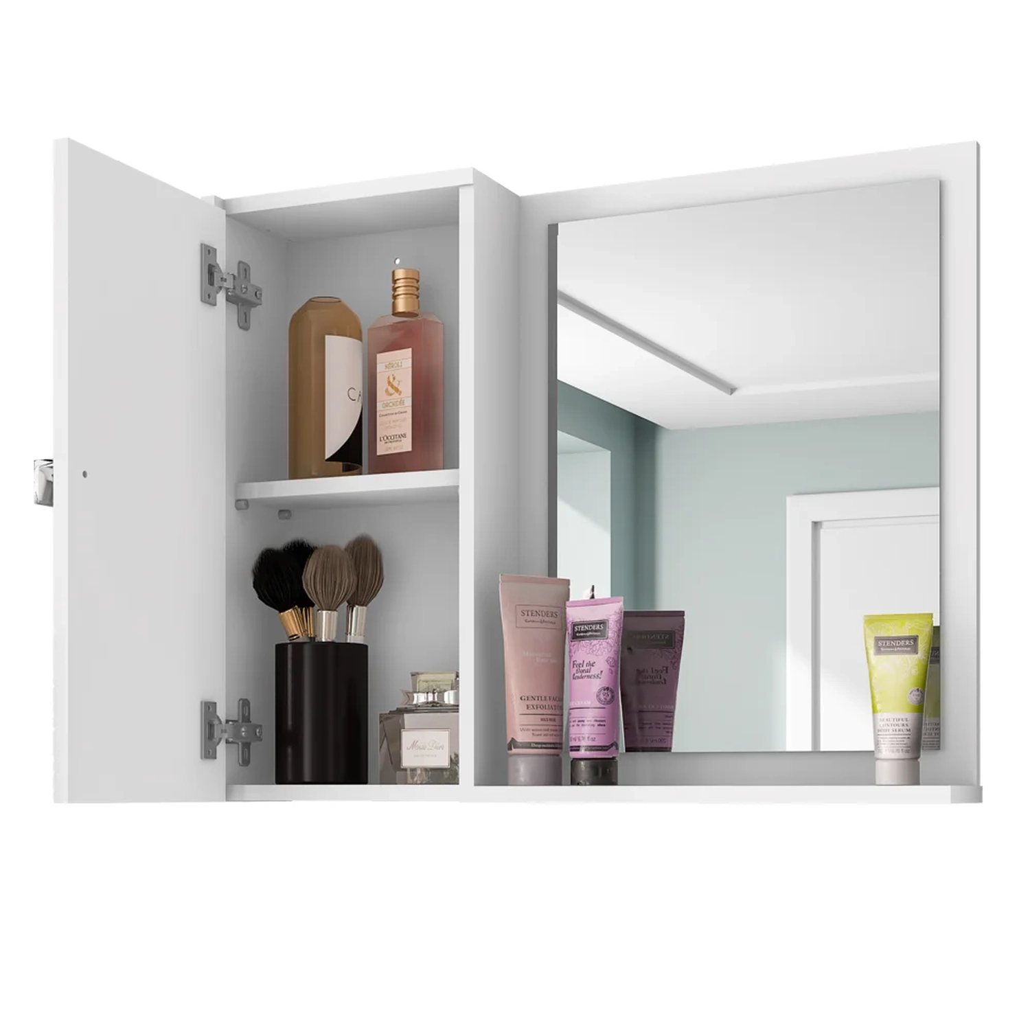 A Espelheira Gênova Branco é ideal para quem não abre mão de um produto de qualidade, isso porque sua estrutura é elaborada de MDP 12mm. Extremamente funcional, conta com uma porta que possui uma prateleira interna, formando 2 nichos com amplo espaço interno, que pode ser usado para guardar todos os produtos de higiene pessoal, dentre muitos outros artigos de beleza utilizados no dia a dia. Além disso, possui um amplo espelho fixado.