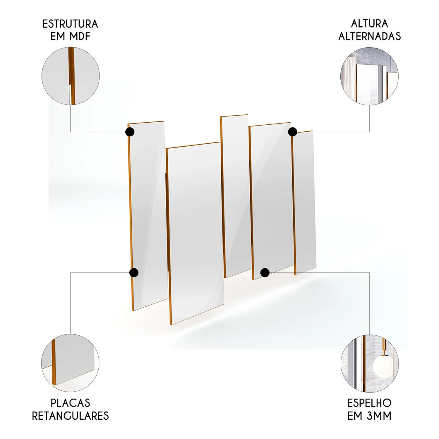 O Espelho Para Sala é composto por cinco placas retangulares em alturas alternadas, cria um efeito visual moderno que amplia a percepção de espaço em Salas de Estar, halls ou corredores.