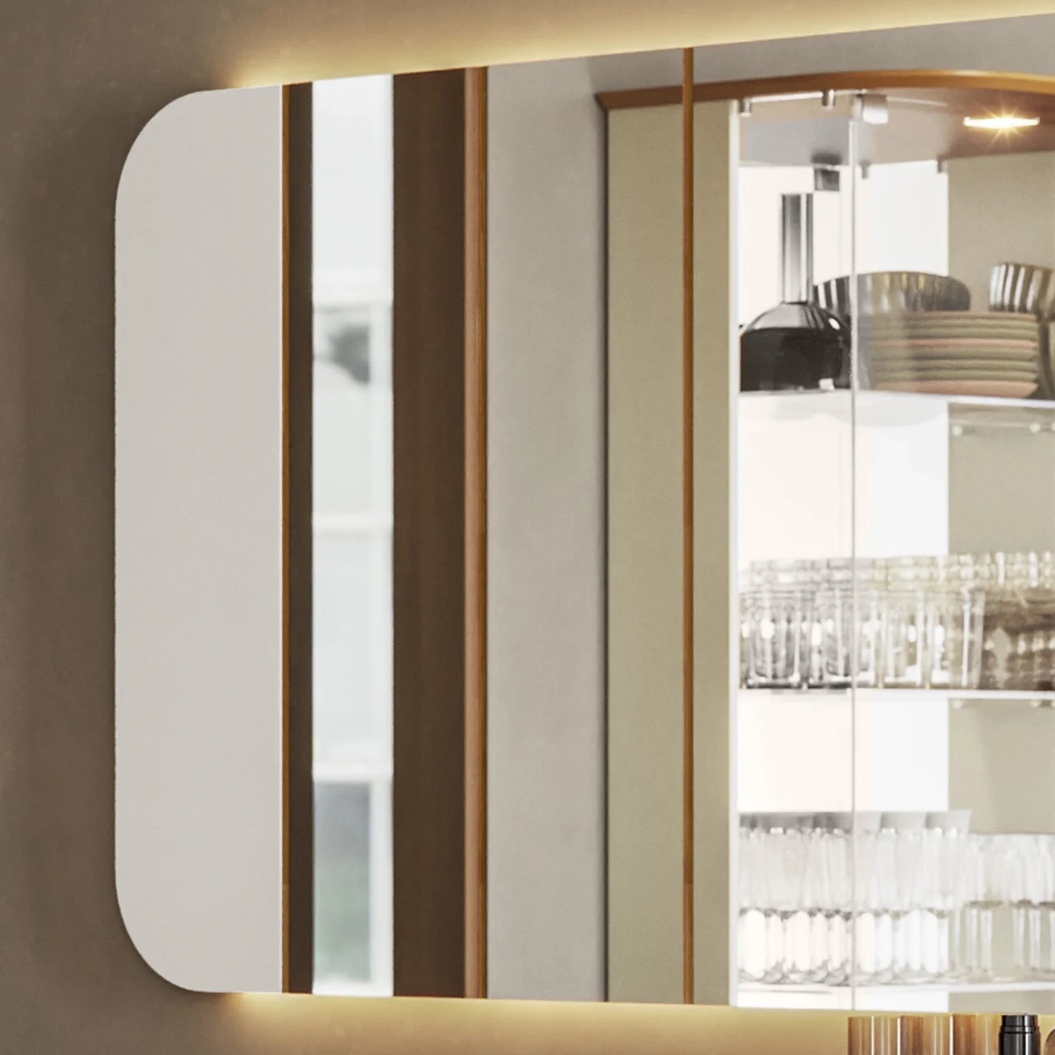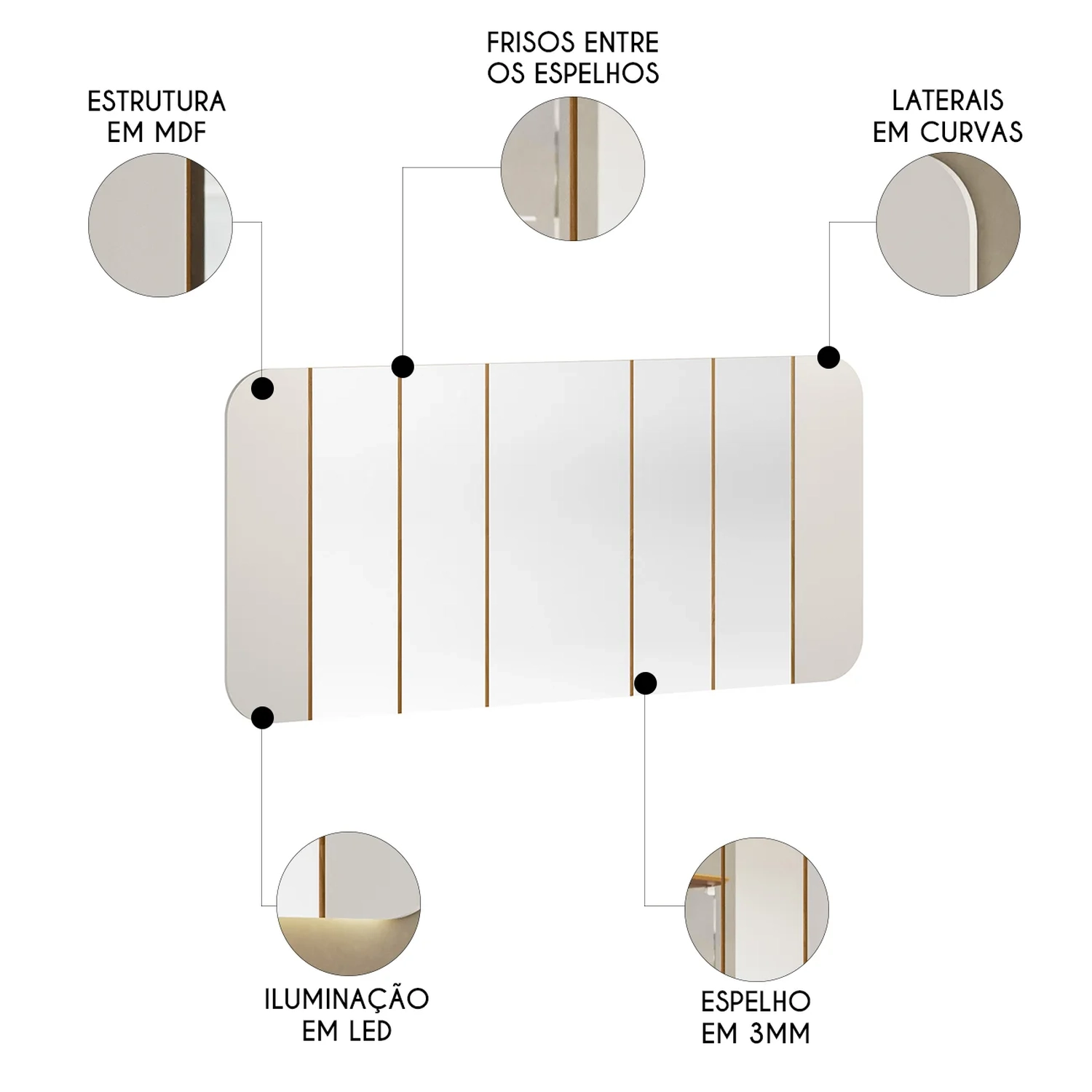 Com seu formato com cantos arredondados, frisos entre os espelhos e LED amplia a sensação de espaço, refletindo a beleza do ambiente de maneira suave e elegante. Ele traz leveza, ampliando a luminosidade e o conforto do local.