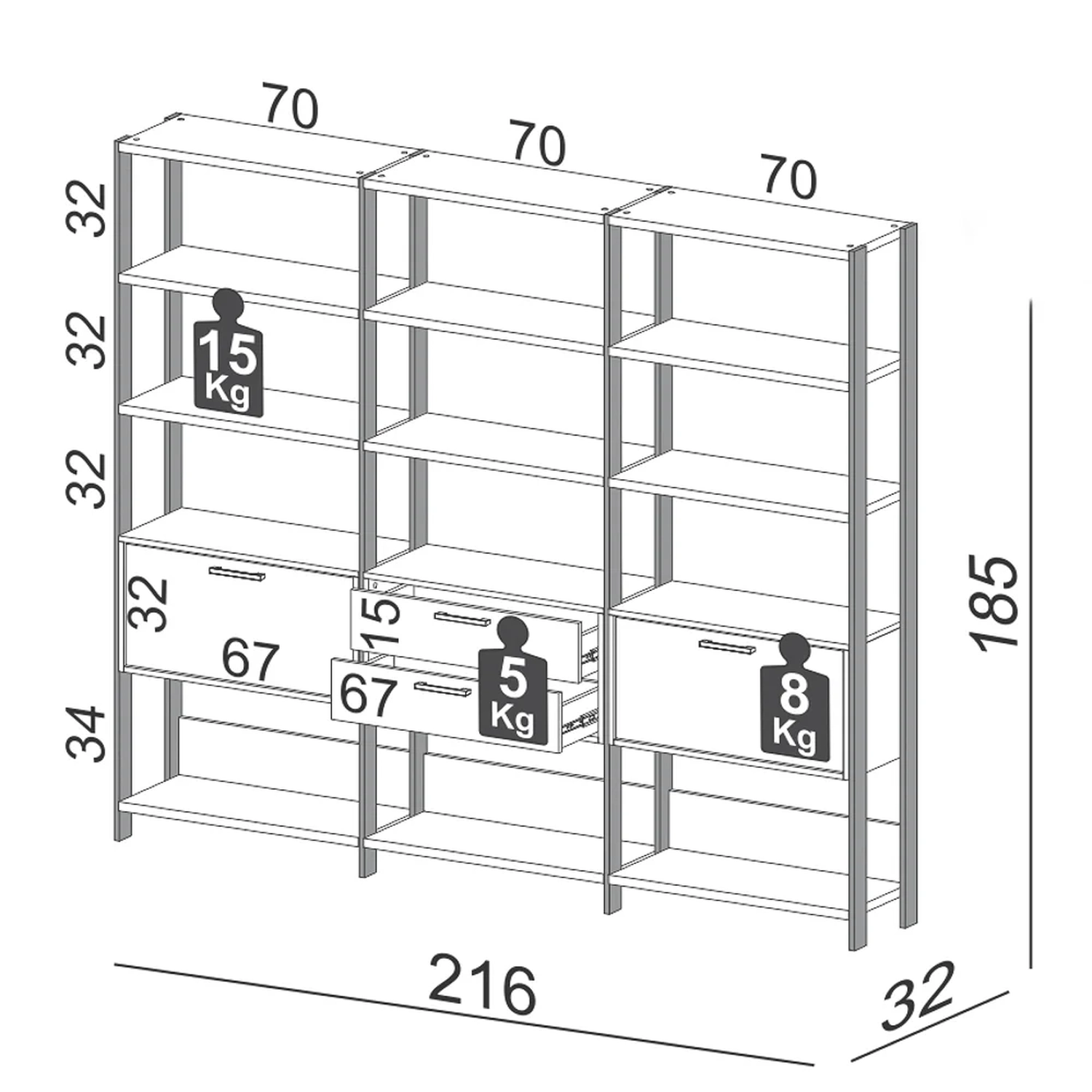 Peso Suportado: 15 Kg prateleira, 5 Kg gaveta e 8 Kg na porta basculante.