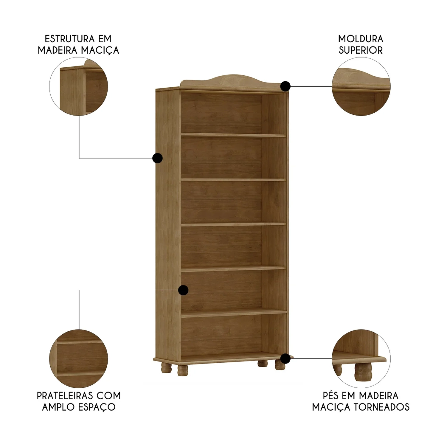 Já a moldura superior e os pés torneados em madeira maciça oferece a este Livreiro uma base robusta e elegante. Uma peça que une funcionalidade, beleza e resistência, ideal para agregar mais vida e aconchego ao seu lar.