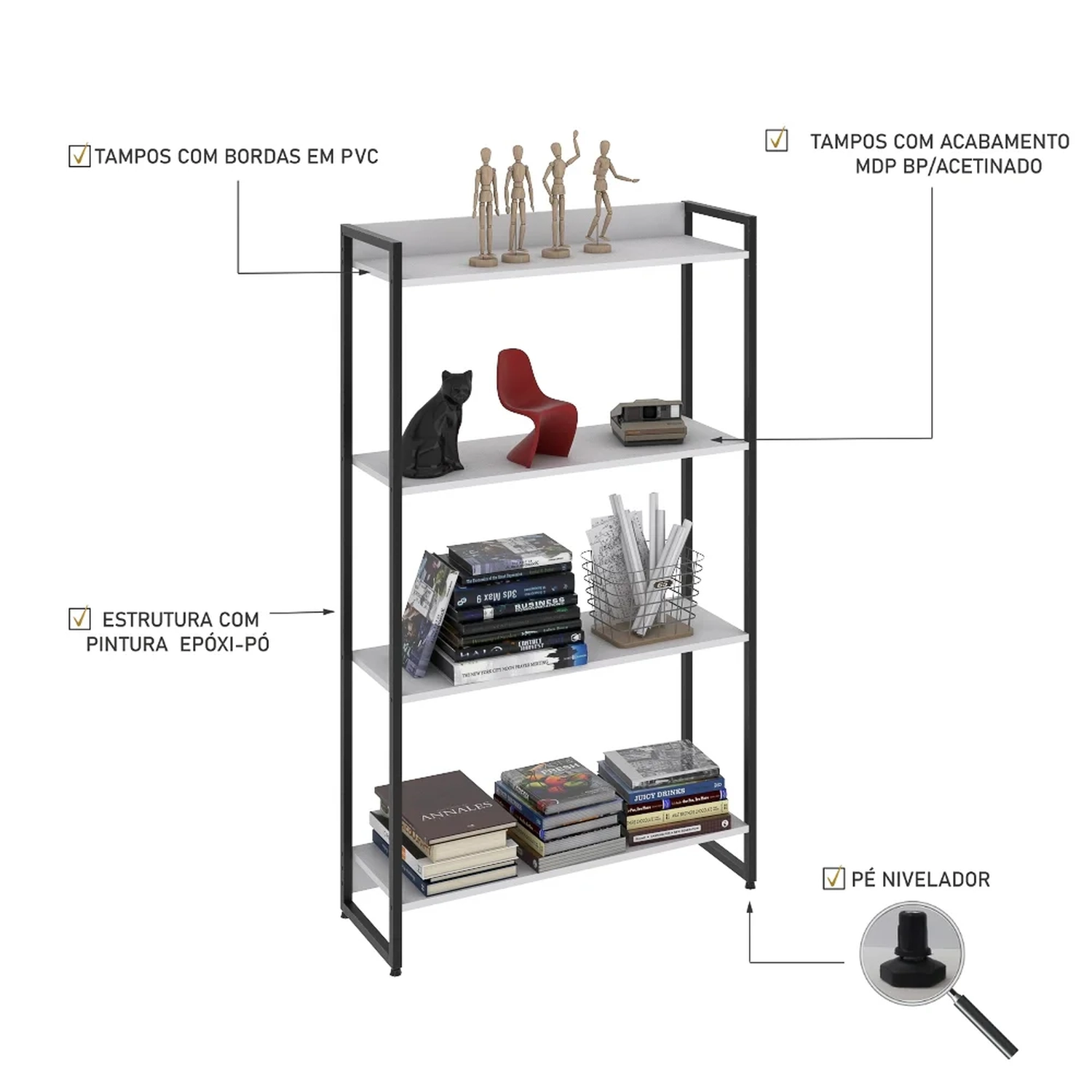 Características do Produto Material da Estrutura: MDP BP/Aço. Peso Suportado: 32 Kg distribuídos. Acabamento: BP Acetinado e Pintura Epóxi-Pó Texturizado. Escala de Brilho: Fosco. Possui Prateleiras: Sim. Quantidade de Prateleiras: 4 Prateleiras. Material das Prateleiras: MDP. Possui Pés: Sim. Tipo de Pés: Sapatas Niveladoras. Possui Rodízios: Não. Diferenciais:
