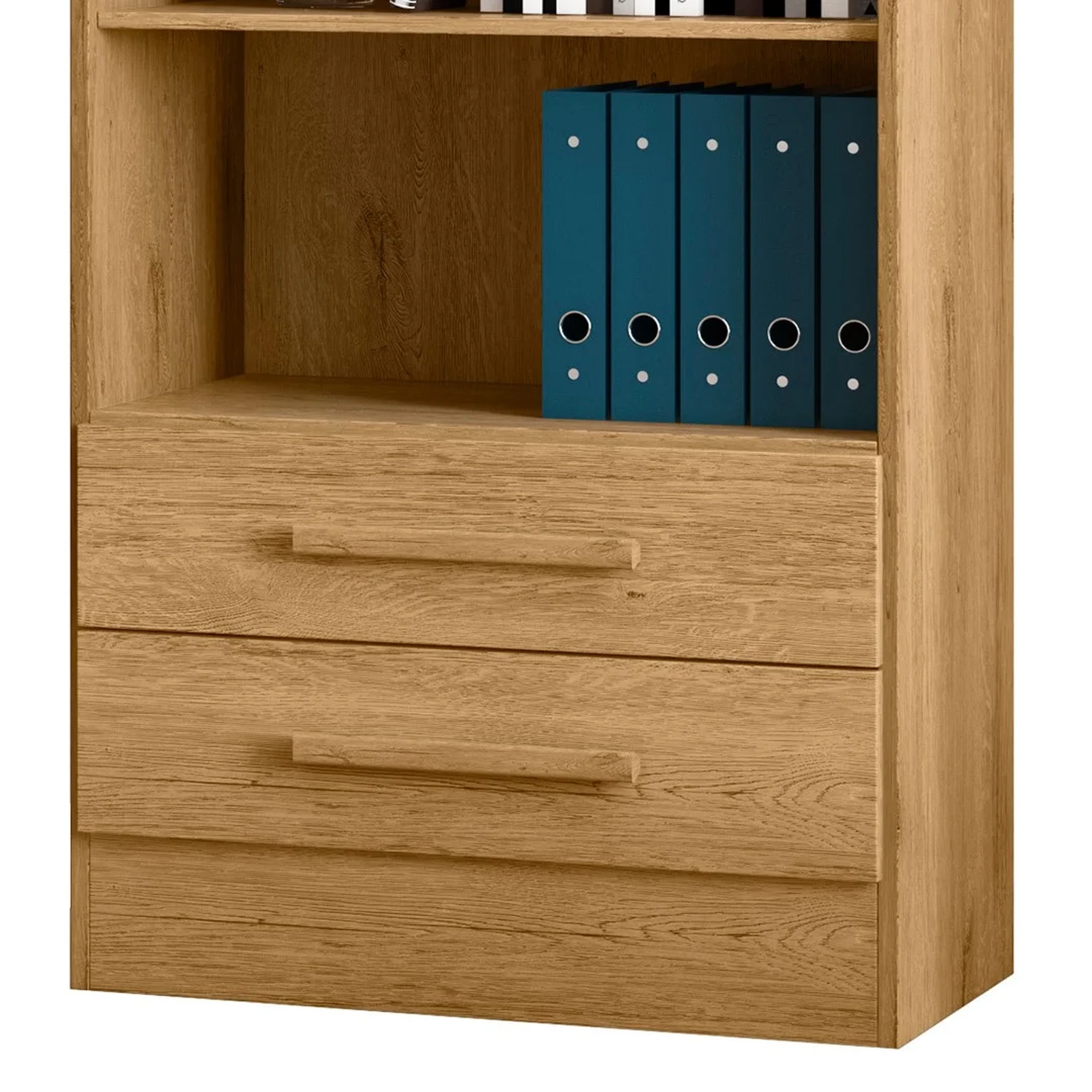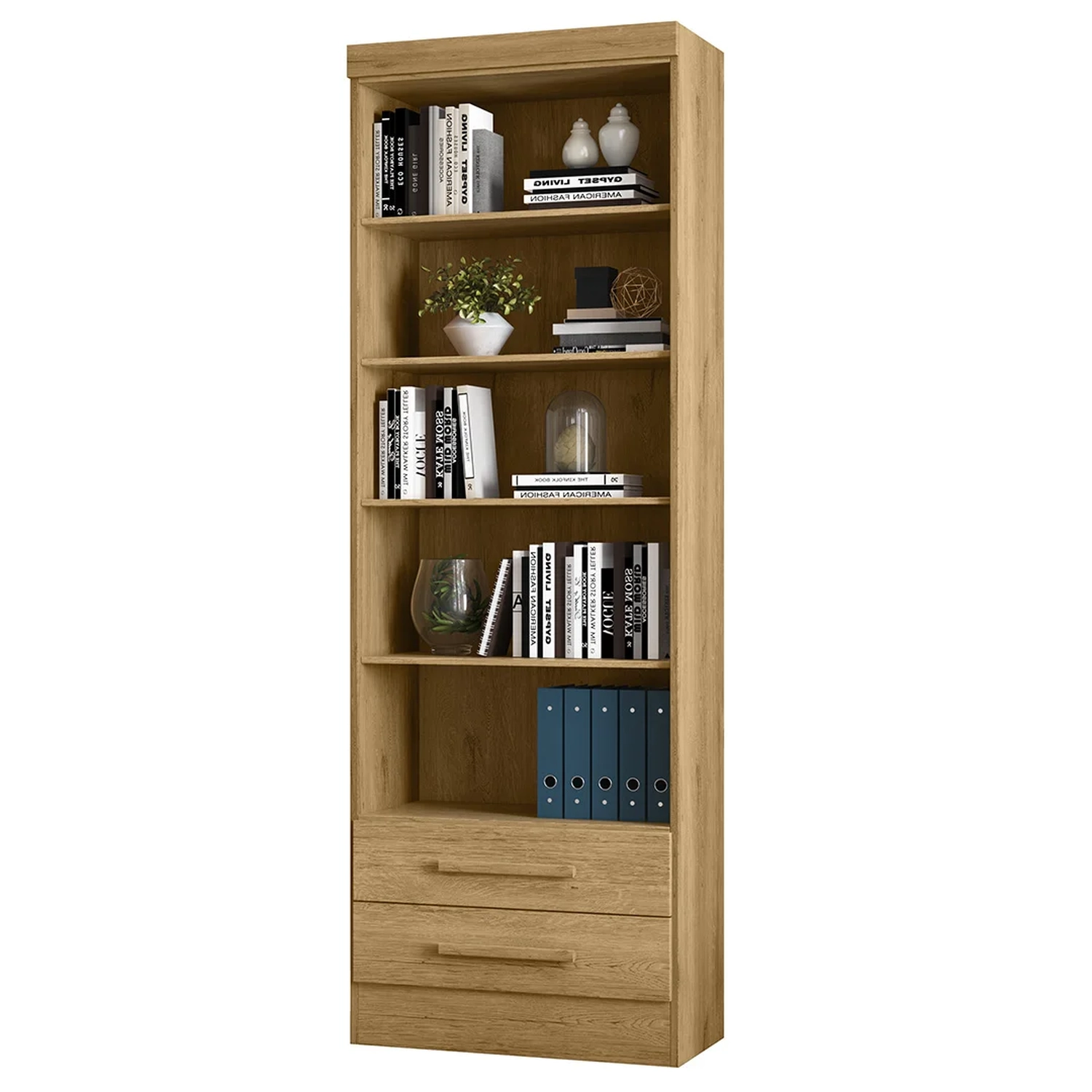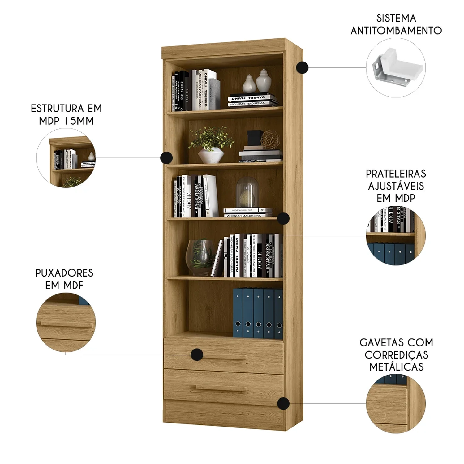 Explore a Estante Livreiro Multiuso 2 Gavetas e Prateleiras Freijó da Qmovi, a escolha ideal para quem busca unir organização e elegância no espaço de leitura.