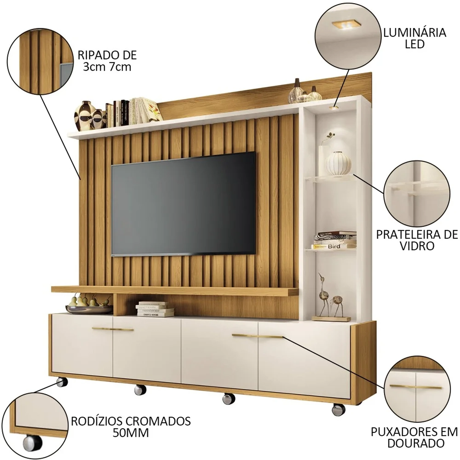 O Home Para Sala possui um visual marcante com o autêntico ripado montado em larguras intercaladas, que dá um toque de sofisticação e modernidade ao ambiente. Além disso, ele conta com quatro portas com dobradiças laterais e puxadores metálicos em tom dourado, que oferecem espaço para guardar objetos e acessórios. O nicho lateral com prateleiras de vidro 6mm é ideal para expor itens decorativos, livros ou eletrônicos. A luminária LED embutida ilumina o painel e cria um clima aconchegante e elegante. O Painel Para TV também possui rodízios cromados de 50mm, que facilitam a movimentação e a limpeza do móvel. O produto é produzido em MDP e MDF, garantindo resistência e durabilidade. O acabamento é feito com pintura UV, que protege o móvel contra riscos e desgastes.