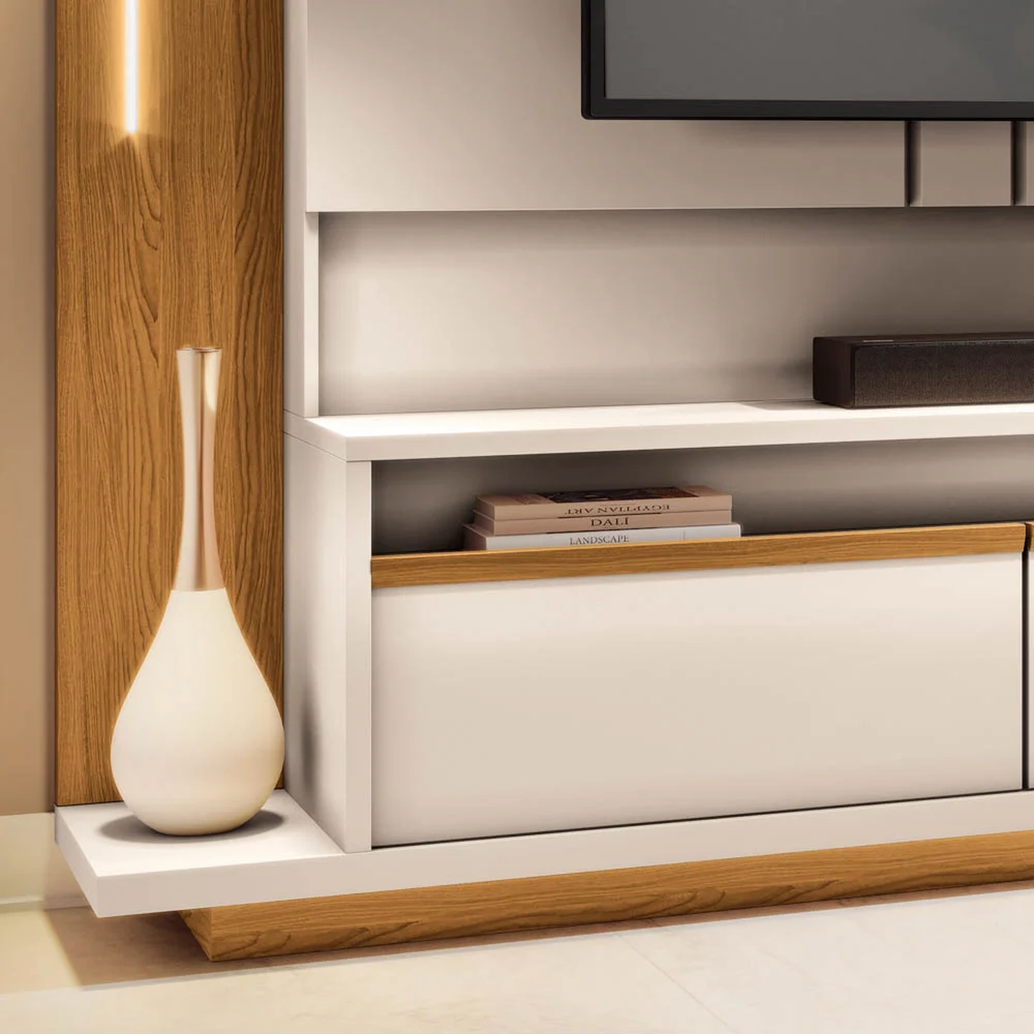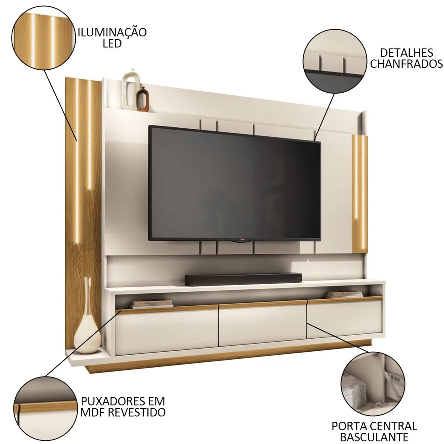 O Painel Para TV suporta até 65 polegadas, enquanto o Home Theater conta com duas portas de correr com trilho em alumínio, garantindo um deslizamento suave e silencioso. Os puxadores em poliestireno com acabamento dourado e o detalhe ripado na parte frontal do rack dão sofisticação e charme à sua decoração.