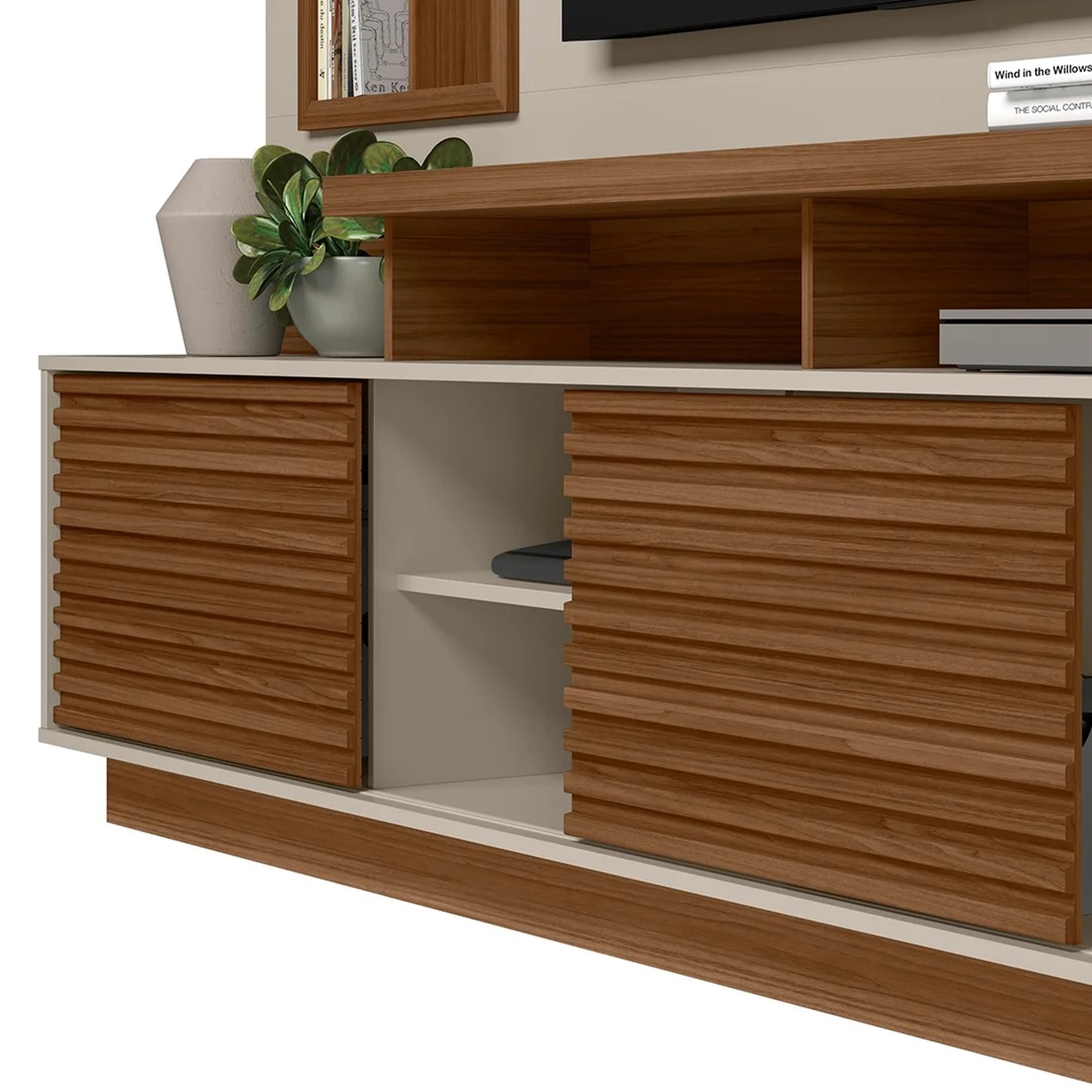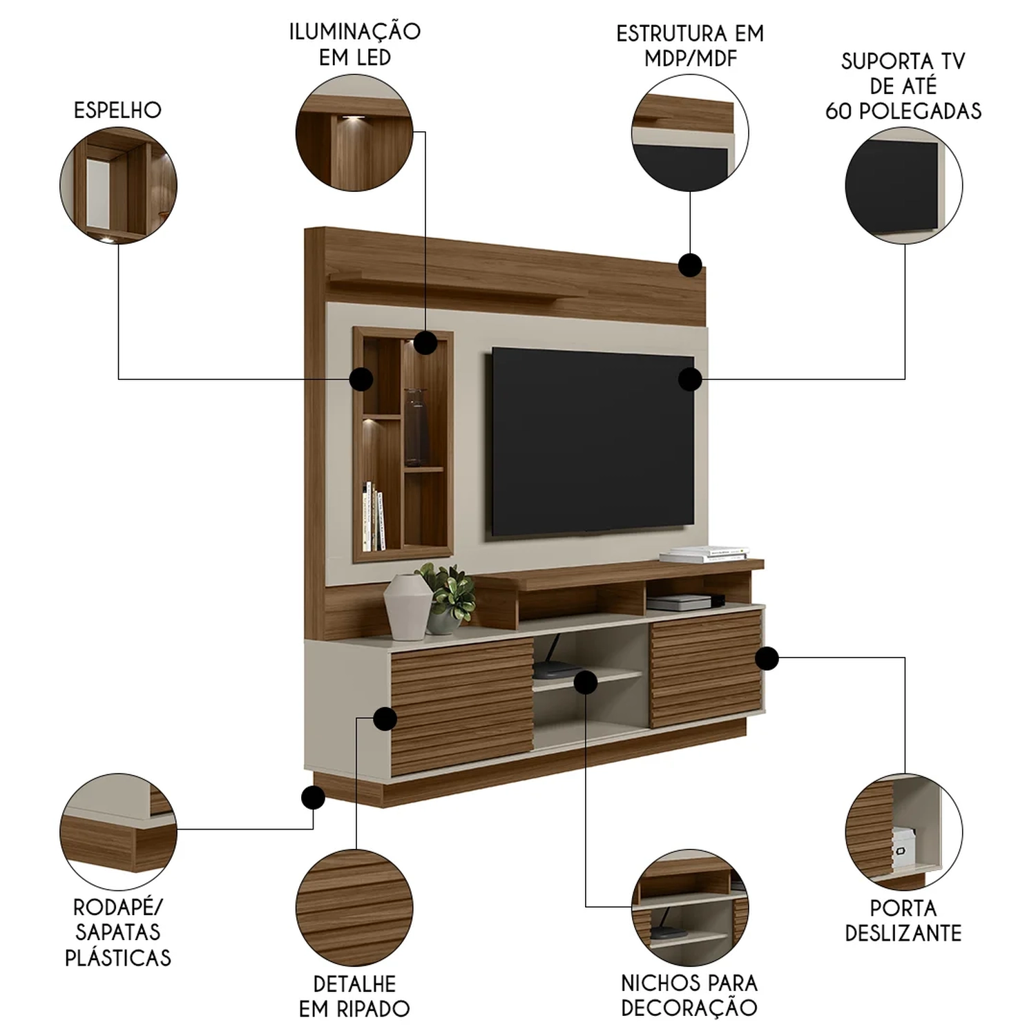 Os compartimentos como prateleiras, nichos e portas oferecem espaço para dispor os mais diversos itens decorativos e eletrônicos, de modo que você consiga dar um toque de personalidade, que expresse a sua família. Além disso, essa estante para sala possui detalhes clássicos que estão sempre na moda, como os espelhos e luminárias LED nos nichos, além dos ripados nas portas deslizantes. Ah, e para vocês curtirem as séries e filmes favoritos, o painel para TV tem capacidade de suportar aparelhos de até 60 polegadas, criando um ambiente de cinema no conforto da sua casa.