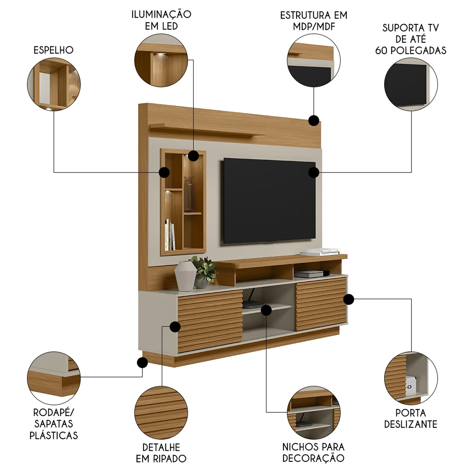 Os compartimentos como prateleiras, nichos e portas oferecem espaço para dispor os mais diversos itens decorativos e eletrônicos, de modo que você consiga dar um toque de personalidade, que expresse a sua família. Além disso, essa estante para sala possui detalhes clássicos que estão sempre na moda, como os espelhos e luminárias LED nos nichos, além dos ripados nas portas deslizantes. Ah, e para vocês curtirem as séries e filmes favoritos, o painel para TV tem capacidade de suportar aparelhos de até 60 polegadas, criando um ambiente de cinema no conforto da sua casa.
