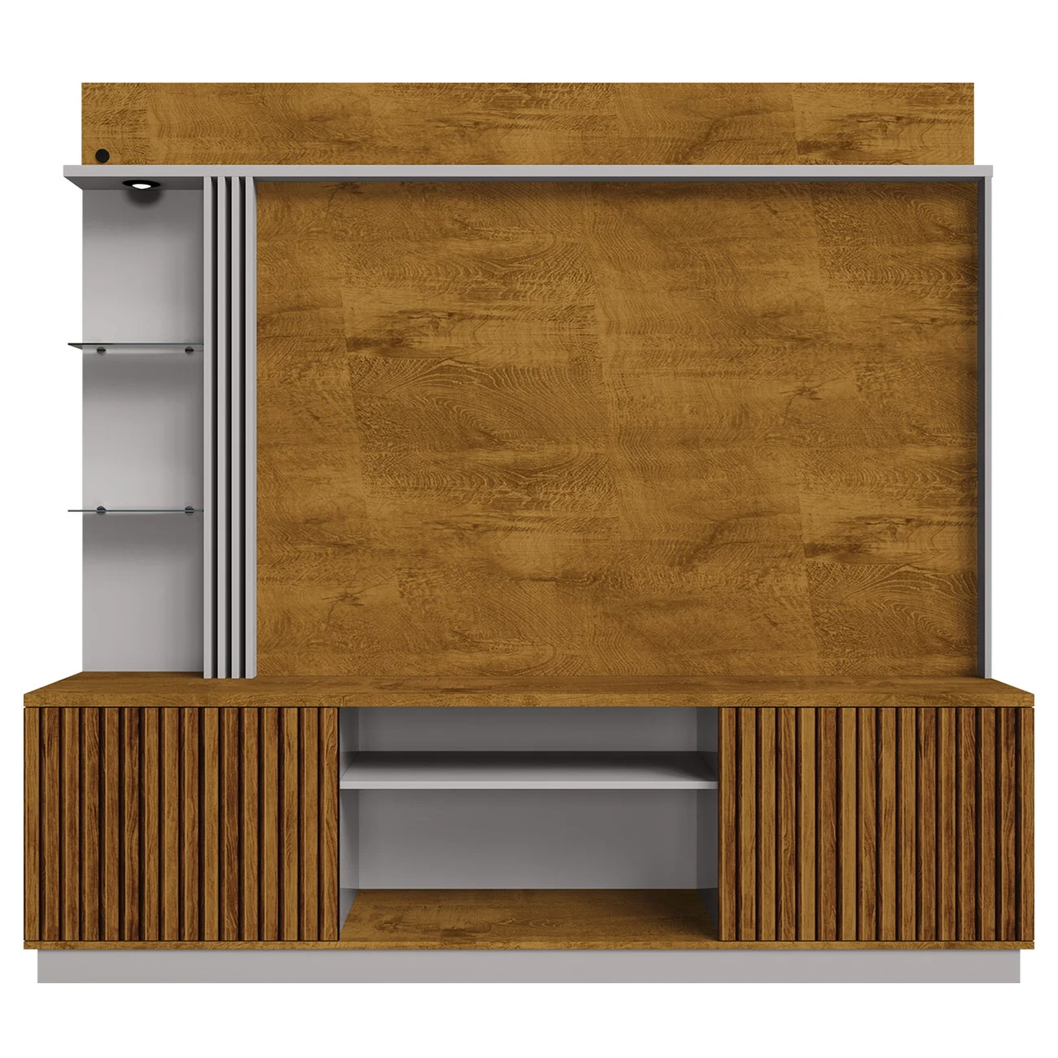 No centro do painel, os nichos abertos oferecem espaço prático para acomodar itens de uso frequente ou objetos decorativos contribuindo com a harmonia visual da Estante Para Sala.