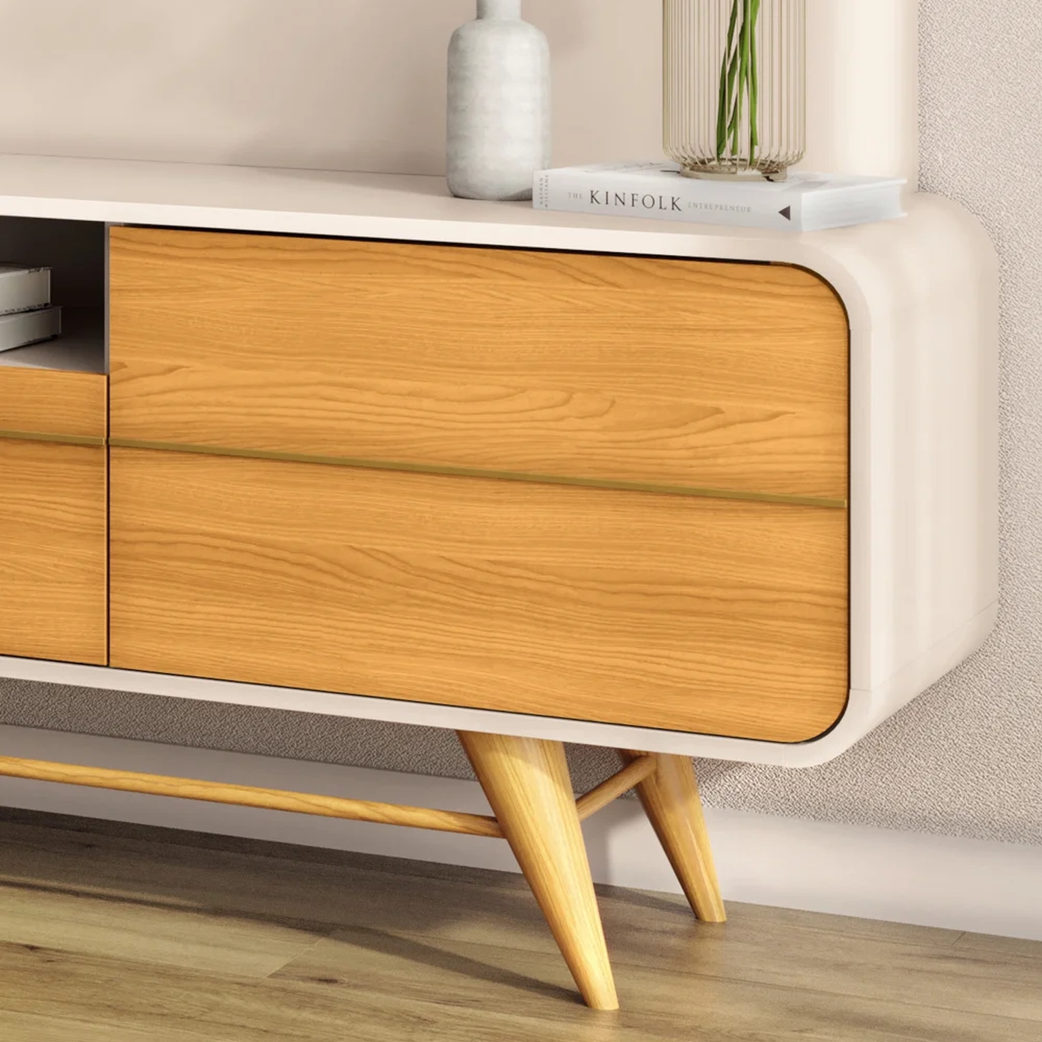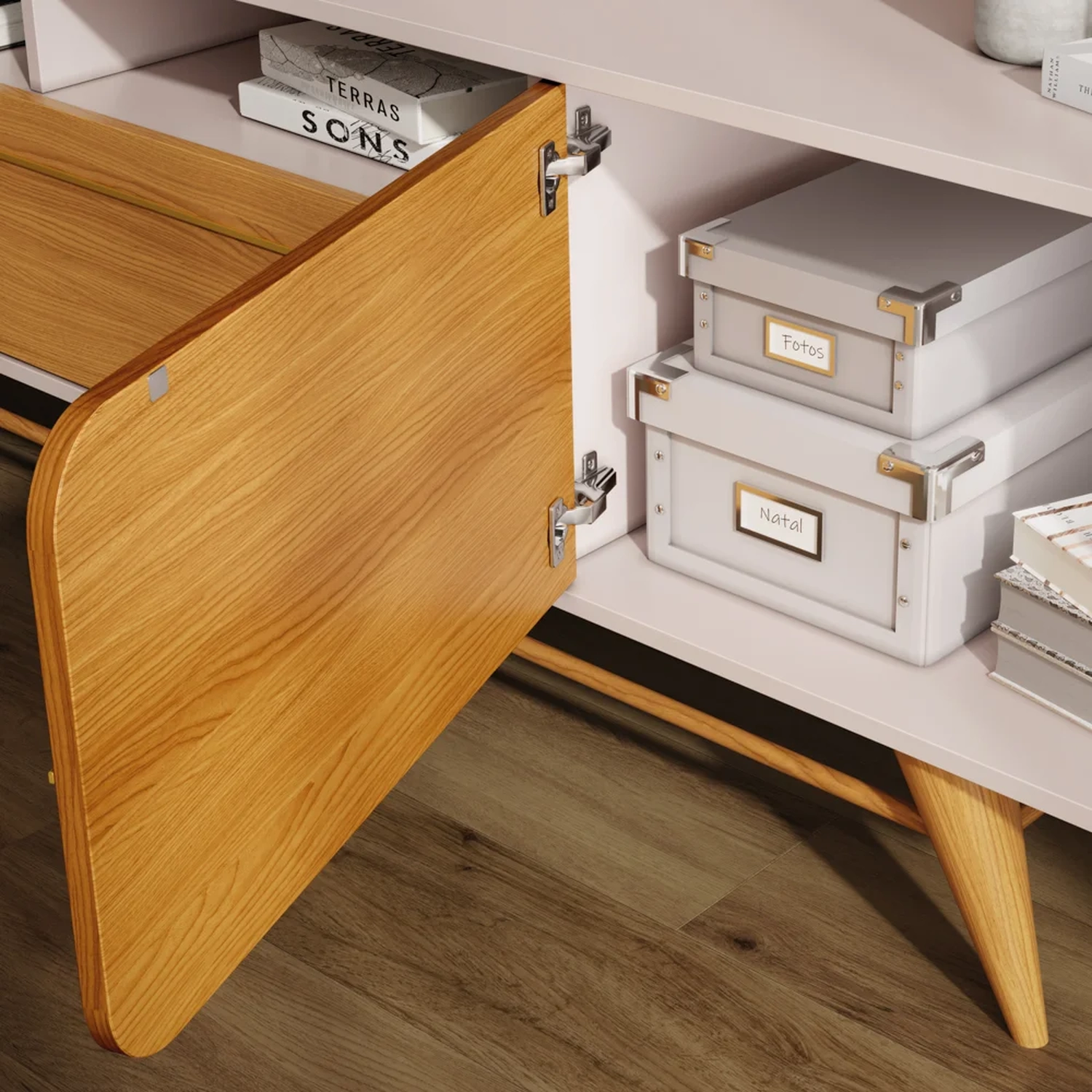 Com um design moderno e inovador, essa estante para sala, além de suportar ideal TVs de até 85 polegadas, ainda adiciona um toque de sofisticação ao ambiente, tornando-se um ícone decorativo para a sua sala de estar. Os pés de madeira maciça torneados fazem referência ao estilo retrô, enquanto os cantos curvos, a iluminação de LED e os filetes decorativos são elementos contemporâneos. Para completar, as 3 portas oferecem espaço de armazenamento adicional, de modo a deixar a bancada livre de bagunças, ao passo que os nichos centrais servem para instalar os demais aparelhos eletrônicos ou até mesmo exibir seus itens decorativos favoritos.