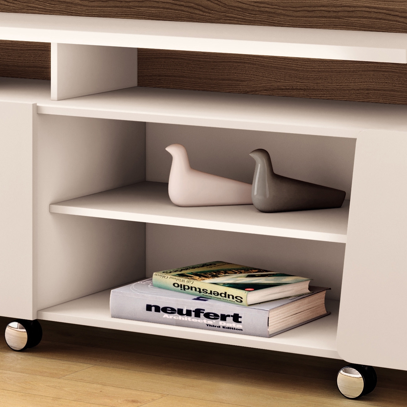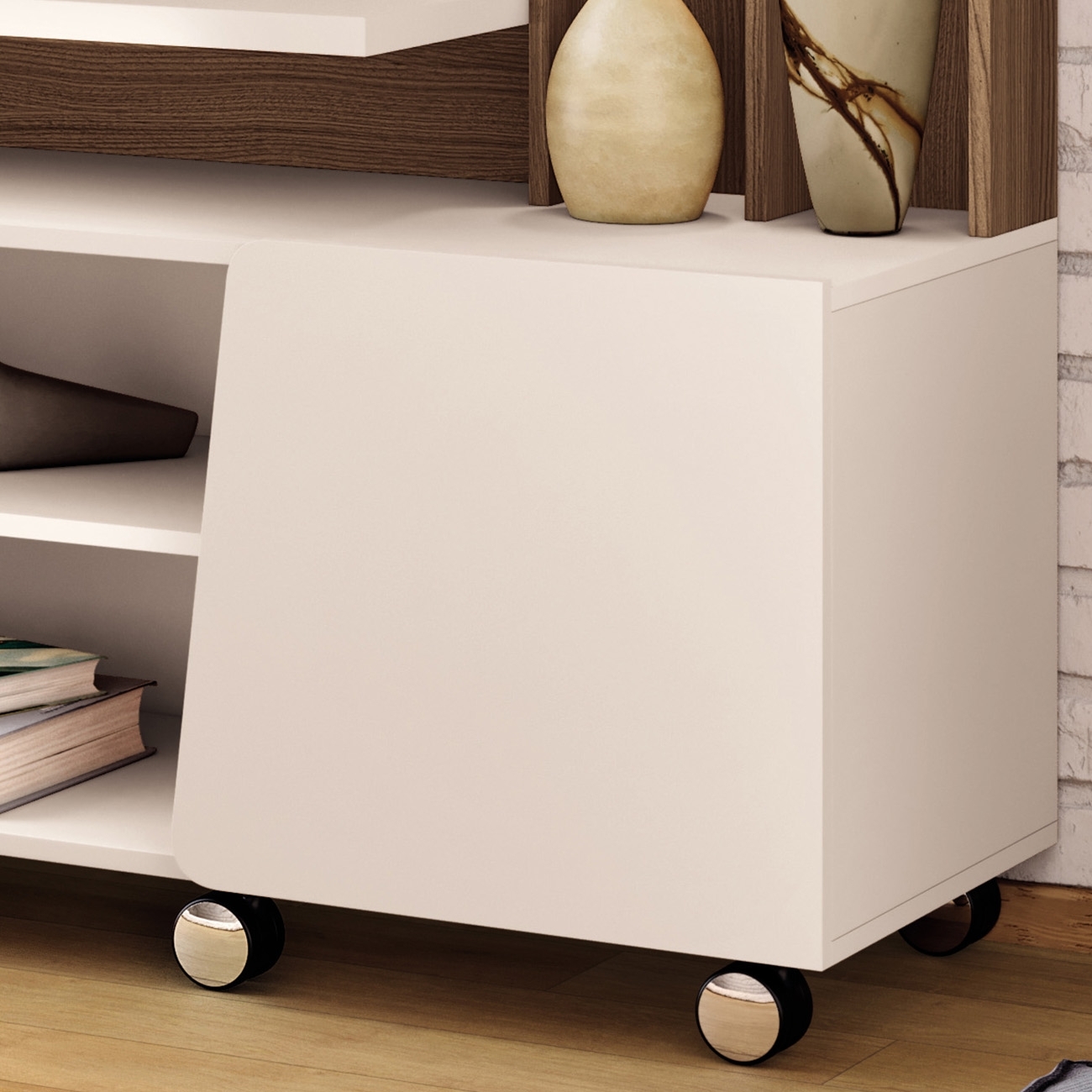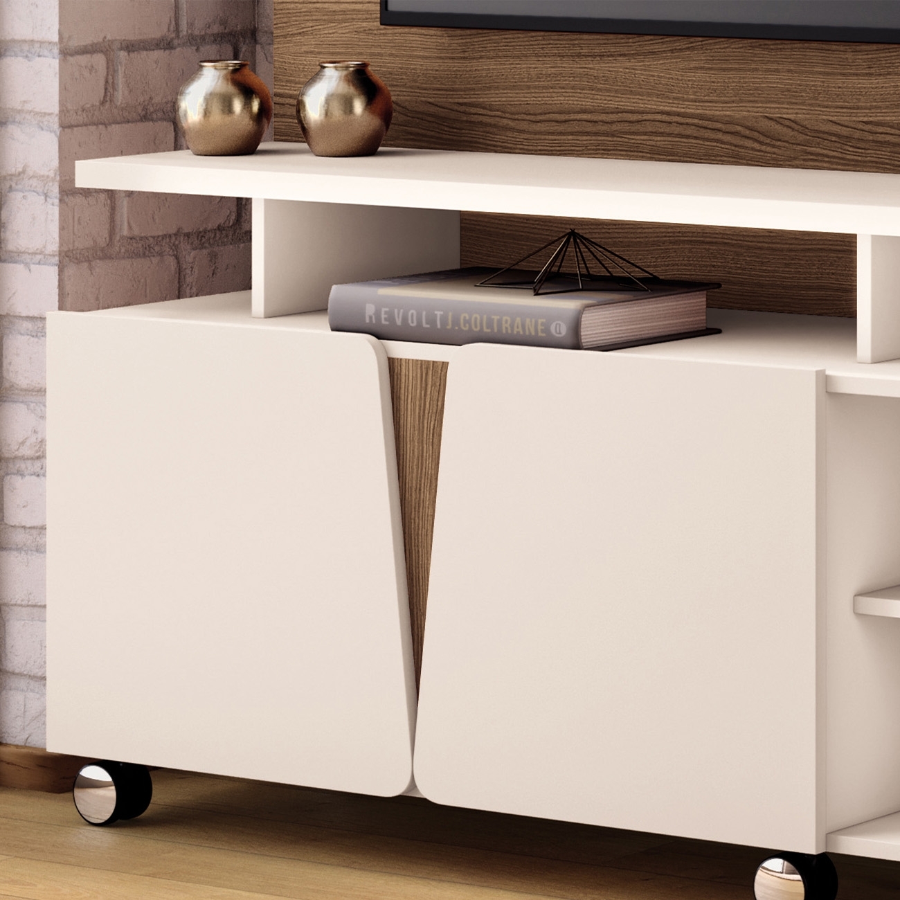 Os rodízios cromados de 50mm permitem movimentação prática e segura, facilitando a limpeza do ambiente. Uma Estante Para TV pensada para unir estética, praticidade e excelente aproveitamento do espaço.