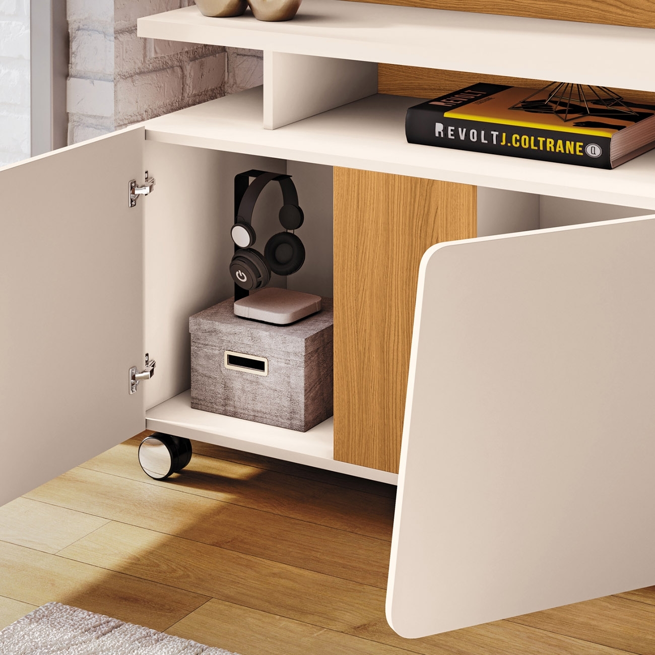 Conta com três portas com dobradiças laterais, além de prateleira inferior removível que facilita a adaptação do espaço interno. Uma solução funcional para apoiar eletrônicos, objetos decorativos e itens do dia a dia.