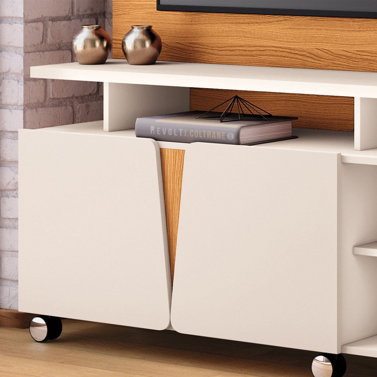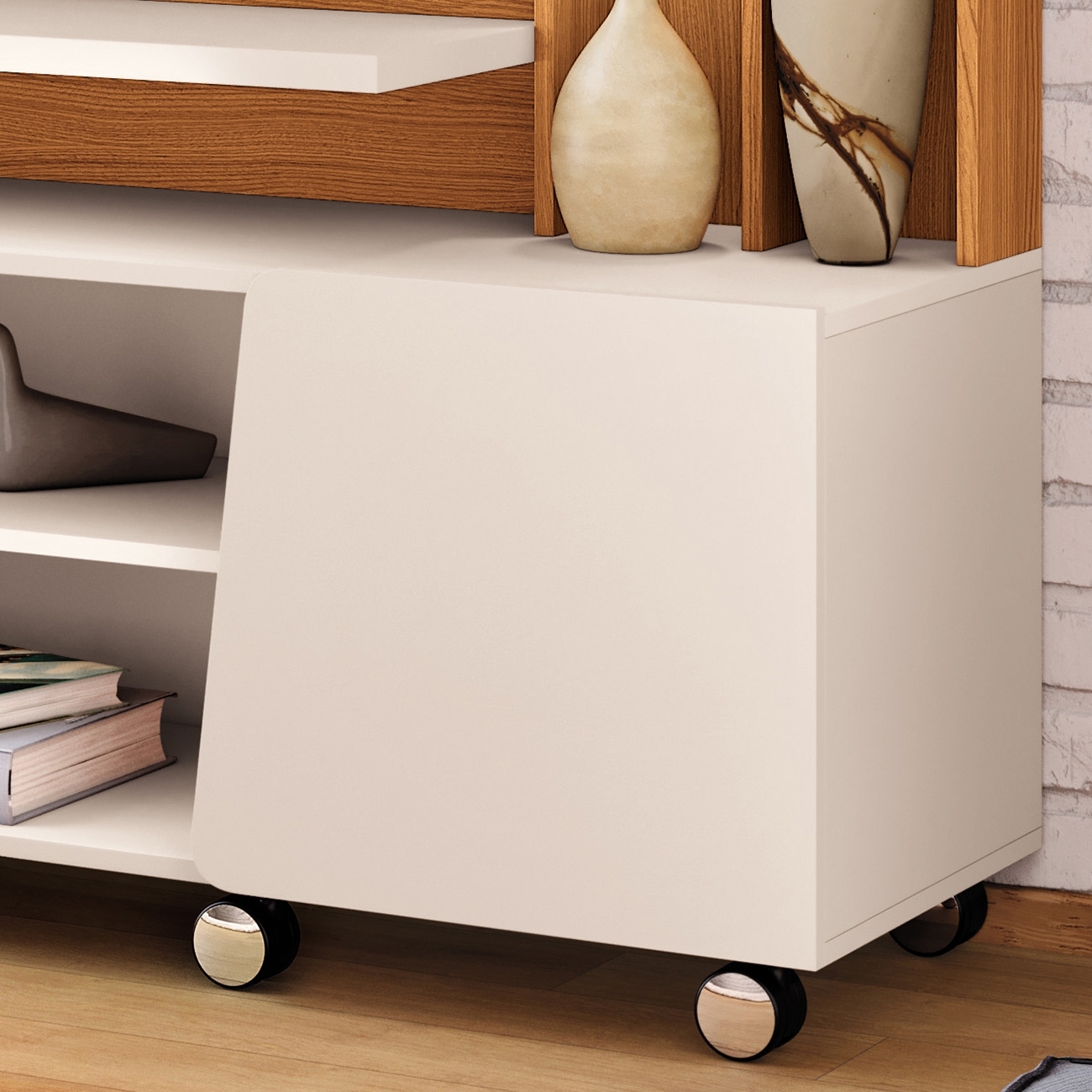 Os rodízios cromados de 50mm permitem movimentação prática e segura, facilitando a limpeza do ambiente. Uma Estante Para TV pensada para unir estética, praticidade e excelente aproveitamento do espaço.