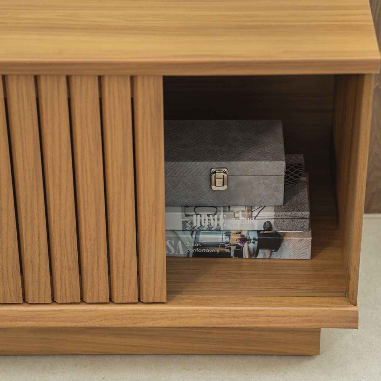O espaço interno foi pensado para acomodar aparelhos eletrônicos e itens decorativos com praticidade. O Painel Para TV suporta modelos de até 75 polegadas, garantindo integração e conforto visual ao ambiente.