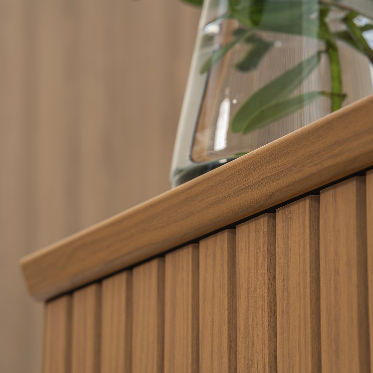 As portas deslizantes com Detalhe Ripado agregam movimento ao design e contribuem para uma organização discreta. O sistema facilita o acesso aos compartimentos internos e mantém o visual limpo no dia a dia.