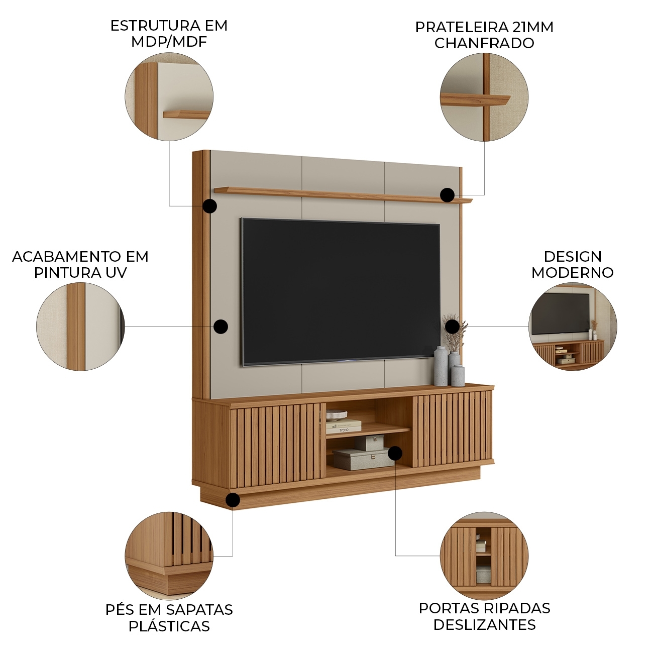 Produzido em MDP e MDF, o conjunto oferece resistência e estabilidade para o uso diário. A prateleira superior em 21mm com detalhe valoriza o acabamento e reforça a presença entre os Móveis Modernos da casa.