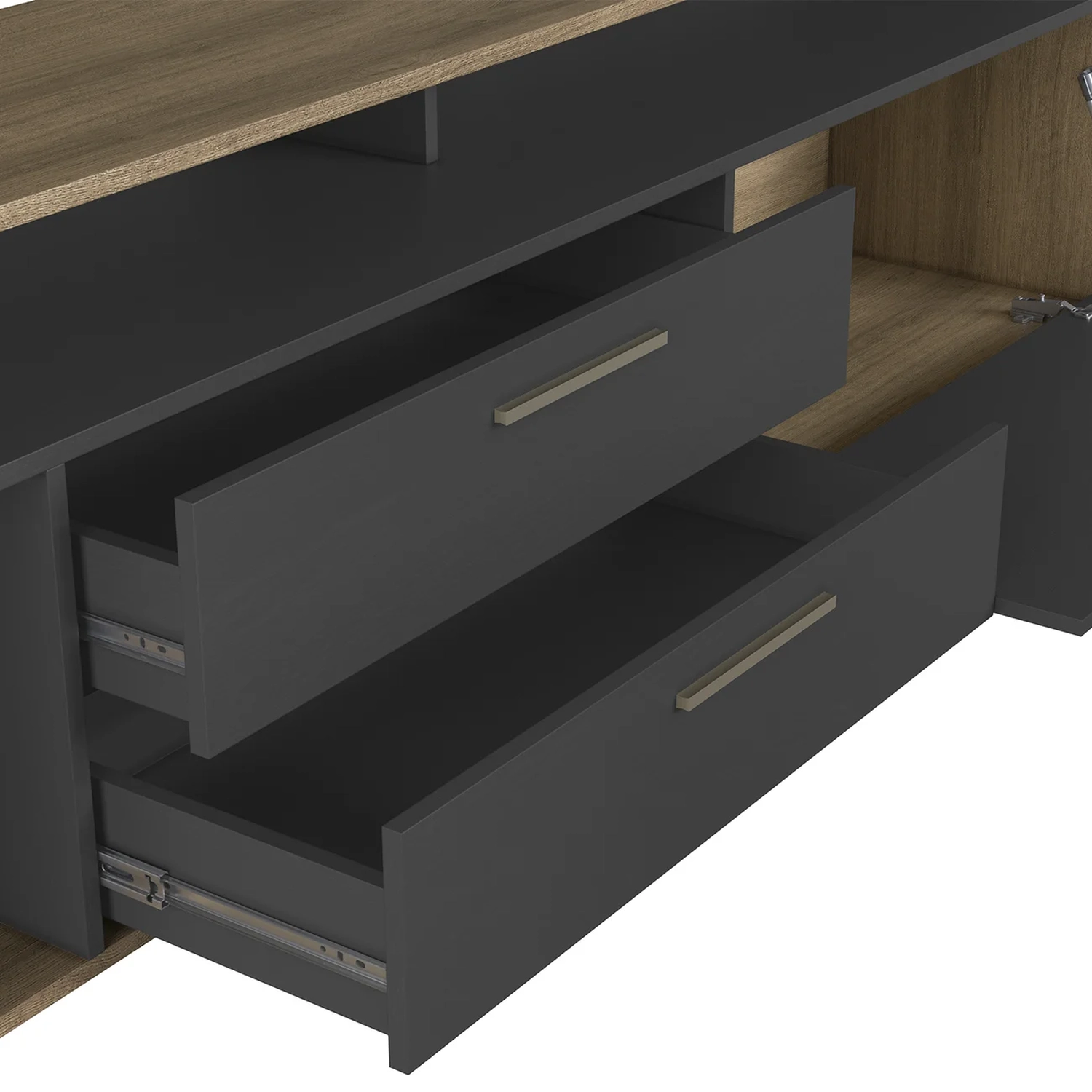 O Rack conta com três nichos amplos, duas gavetas espaçosas, uma porta basculante com pistão a gás e dobradiças metálicas, além de iluminação em LED com interruptor, que se destaca no ambiente. Também possui dois passa fios para facilitar a organização dos cabos.