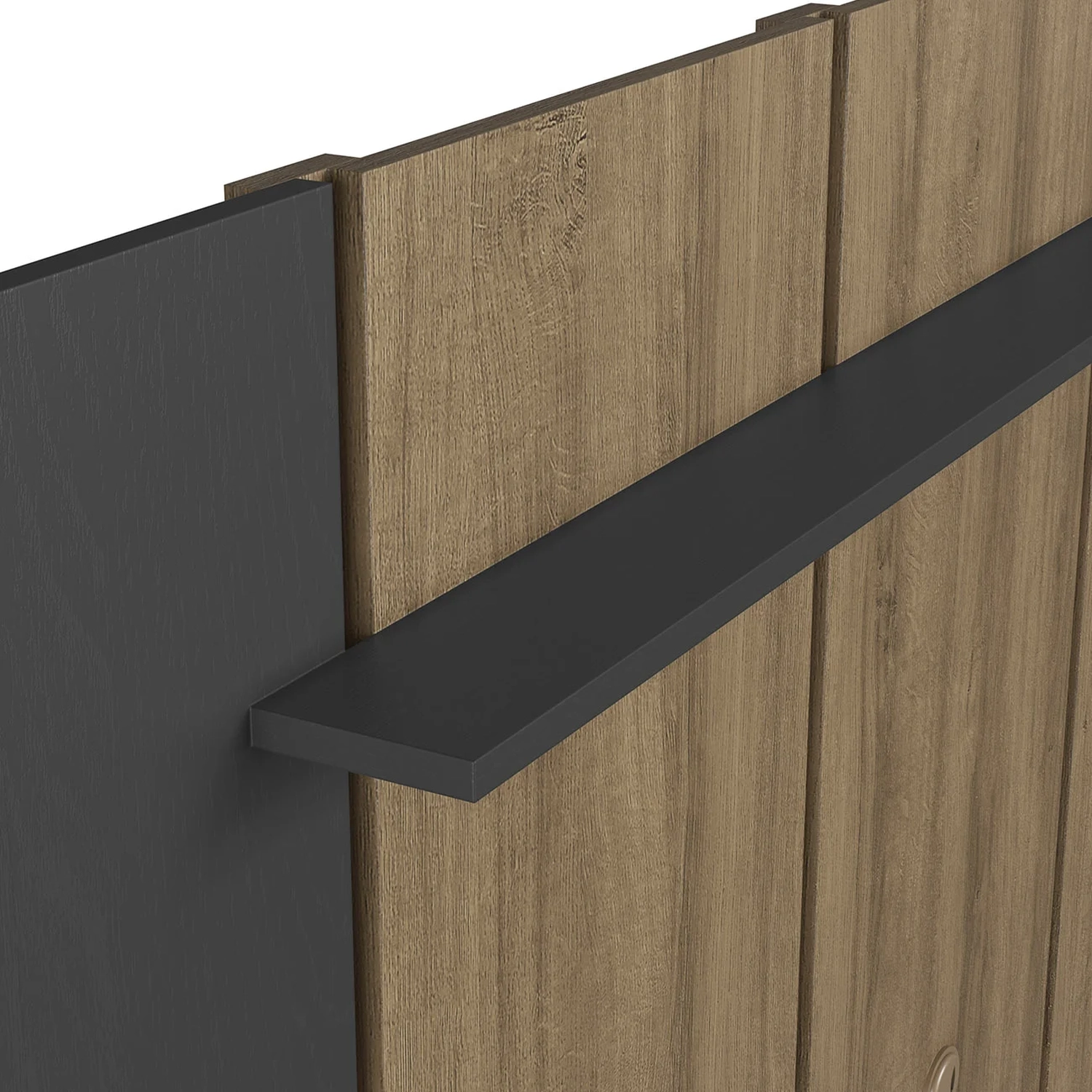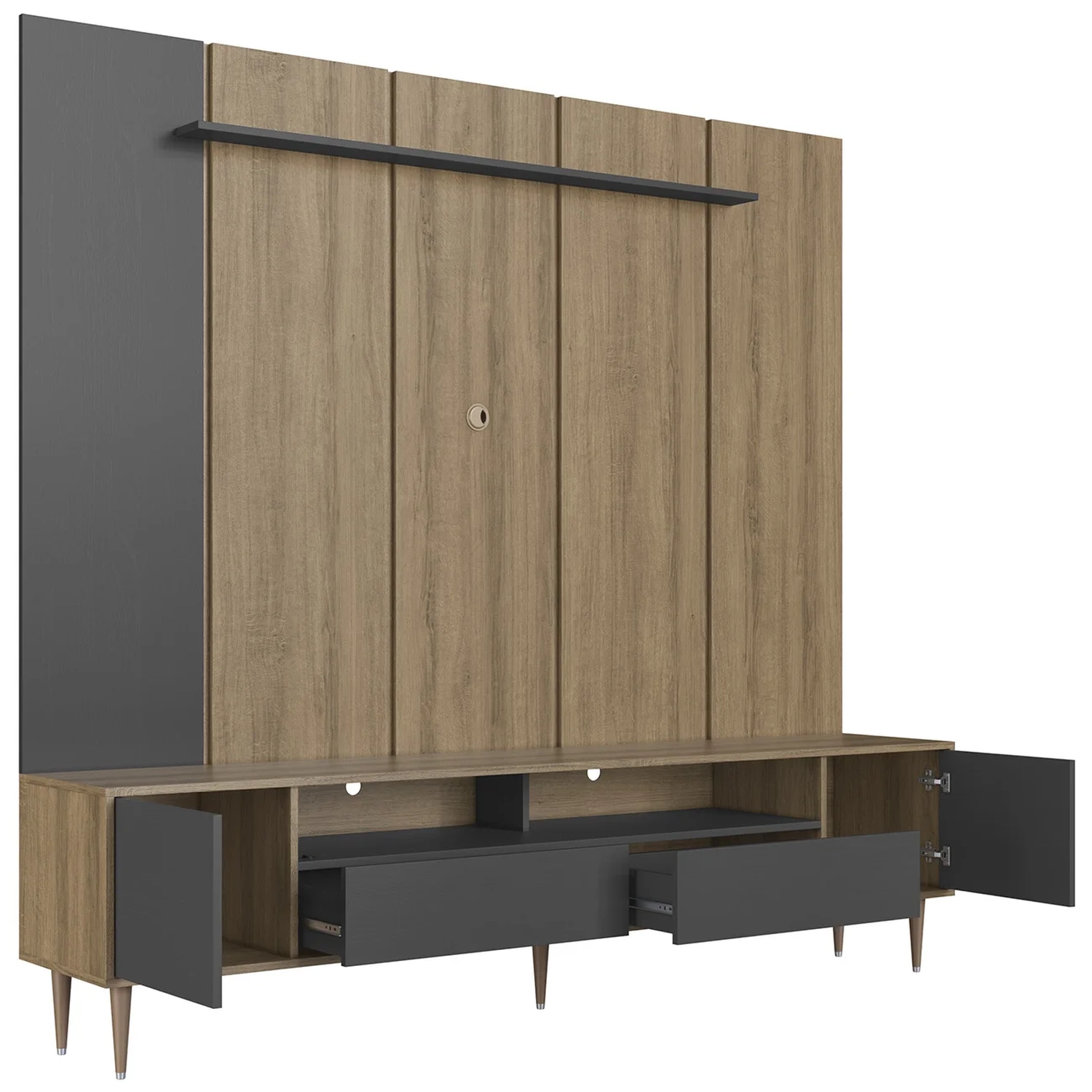 O Painel segue o mesmo padrão dos conjuntos anteriores, com prateleira superior e passa fios, ideal para complementar o visual e acomodar seus equipamentos de forma prática e harmoniosa na Sala Moderna.