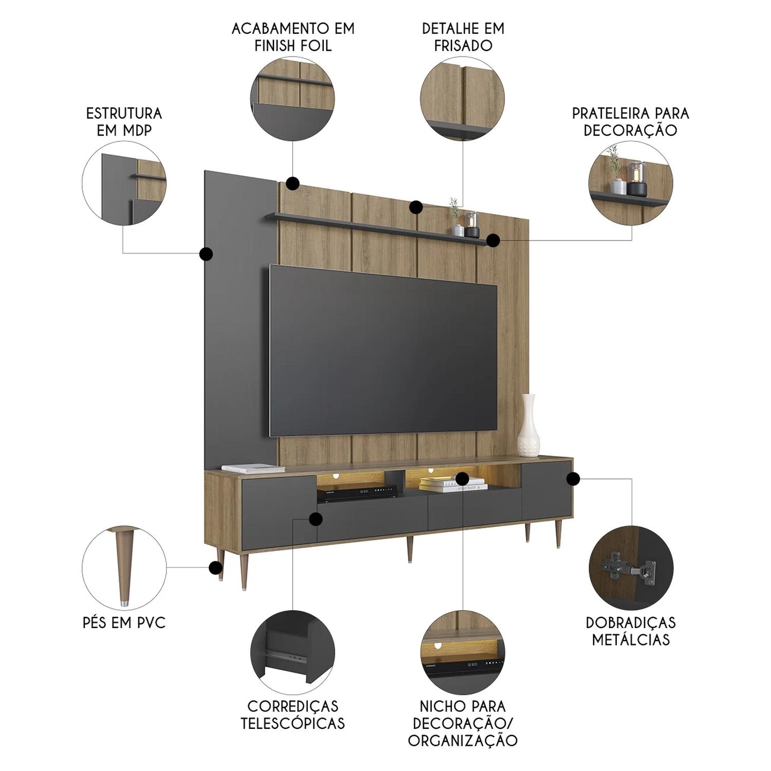 Além do design elegante, o Rack conta com duas gavetas com corrediças telescópicas, duas portas de giro com dobradiças metálicas, pés em PVC de 17cm e iluminação em LED com interruptor para ligar e desligar. Também possui dois passa fios para manter o ambiente sempre organizado.