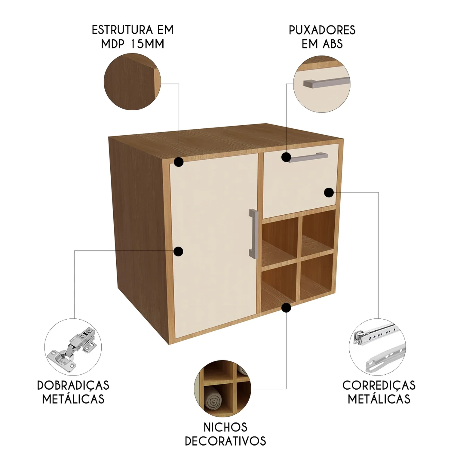 Este Armário de Banheiro possui uma composição completa, contando com uma porta com prateleiras internas bem distribuídas, uma gaveta funcional e quatro nichos decorativos.