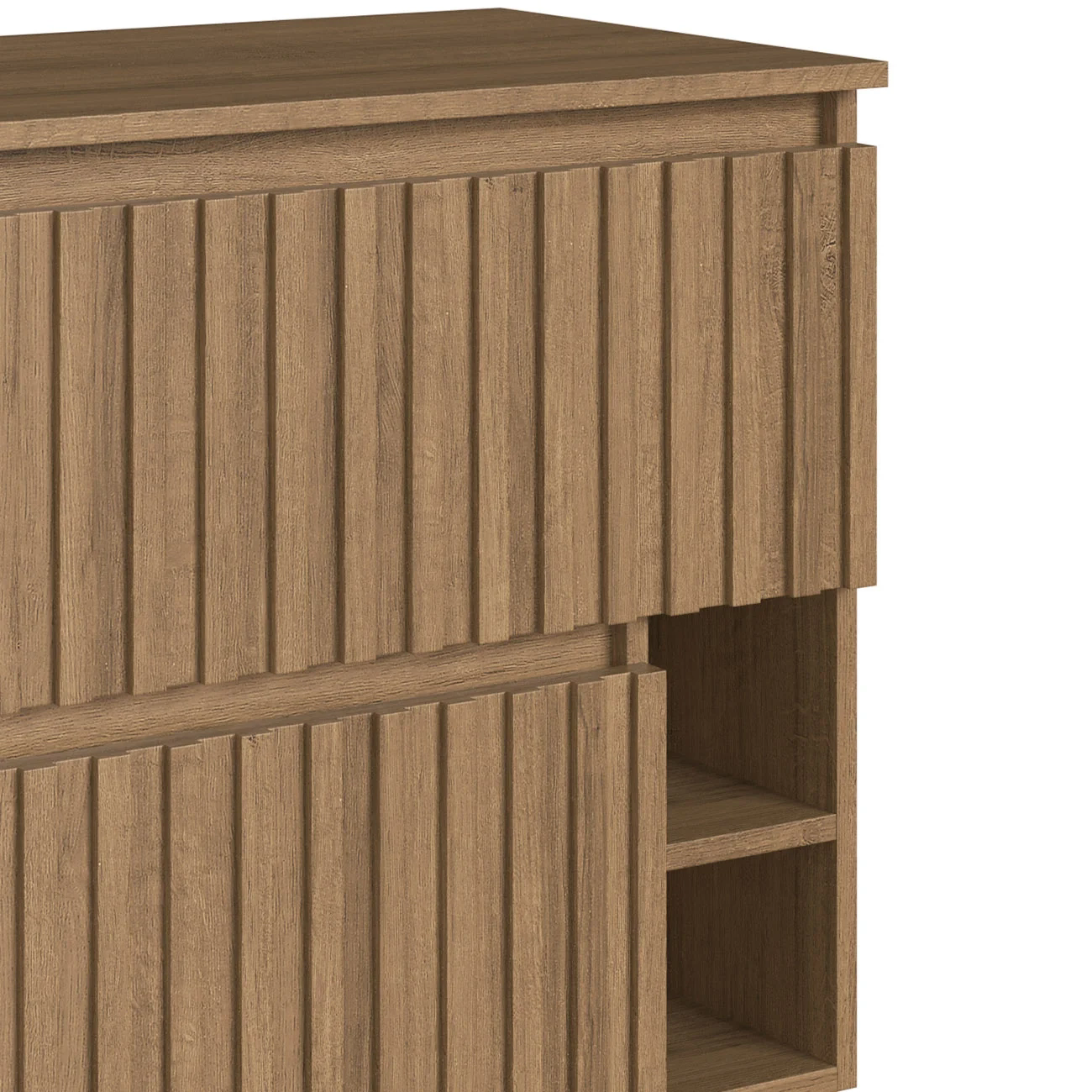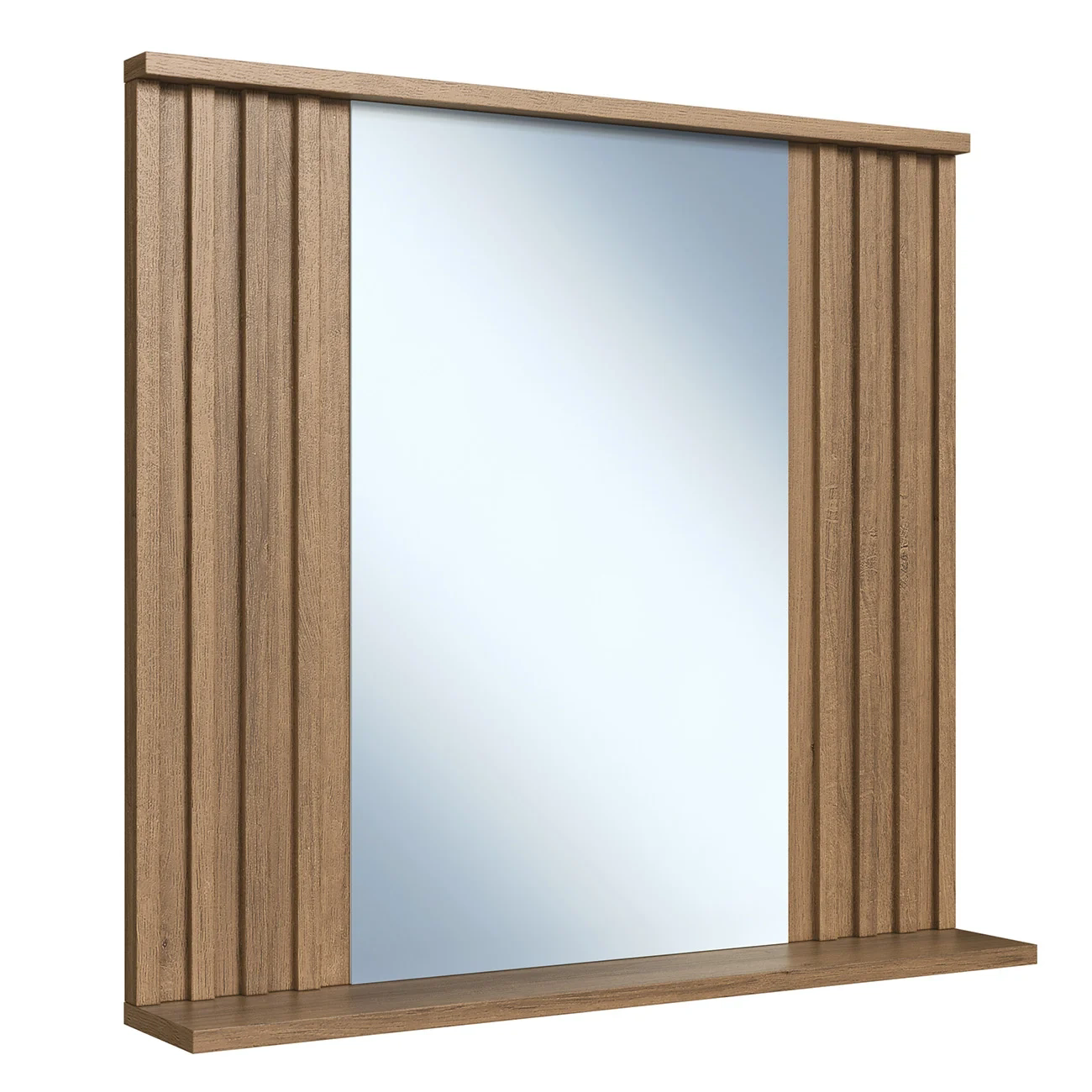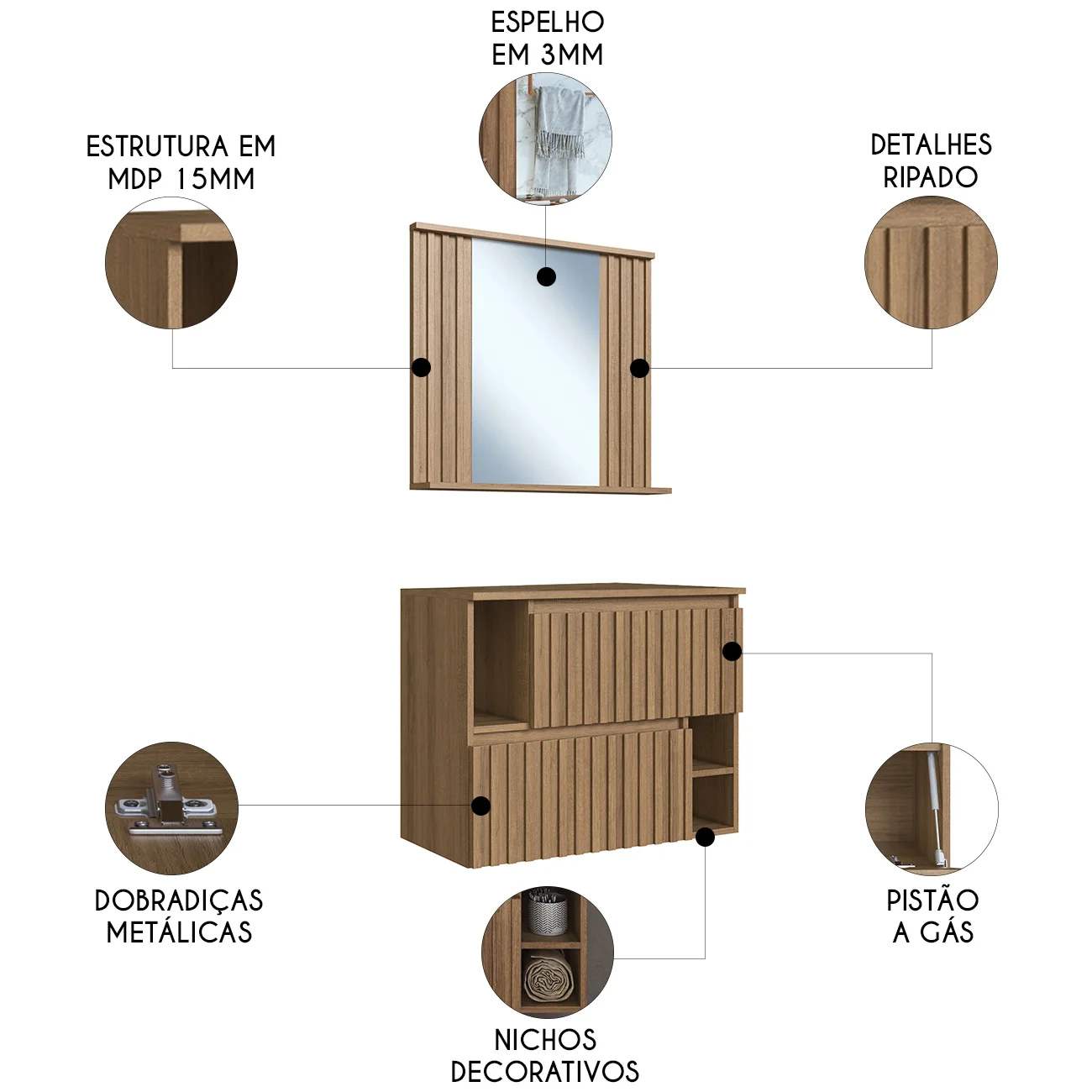 A Espelheira Para Banheiro conta com uma prateleira funcional para acomodar itens de uso diário e detalhes ripados nas laterais, que agregam um toque moderno ao design. É uma peça versátil que combina praticidade com estilo na composição do ambiente.