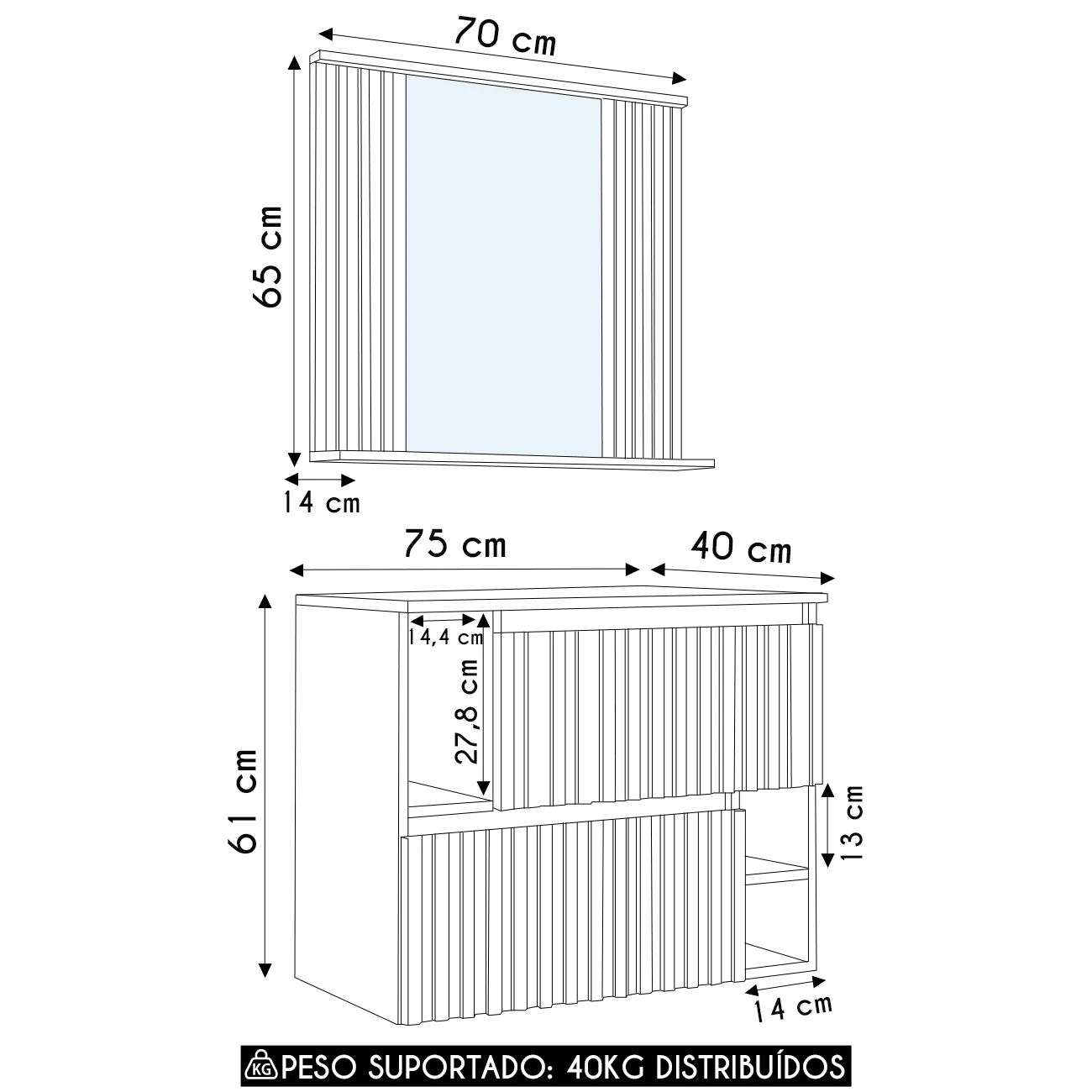 Peso Suportado Distribuído: Gabinete 30 Kg / Espelheira 10 Kg.