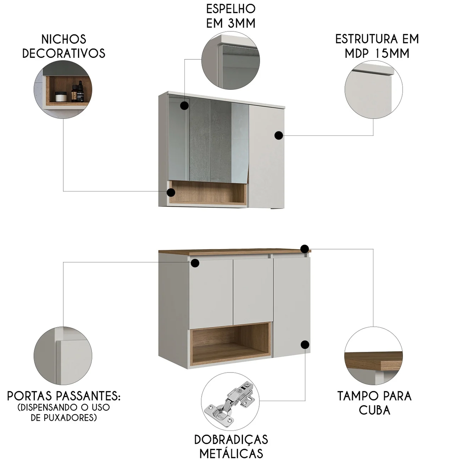 O Gabinete de Banheiro com Espelho é confeccionado em MDP de 15mm e vem acompanhado de um armário superior com espelho de 3mm, oferecendo resistência e durabilidade.