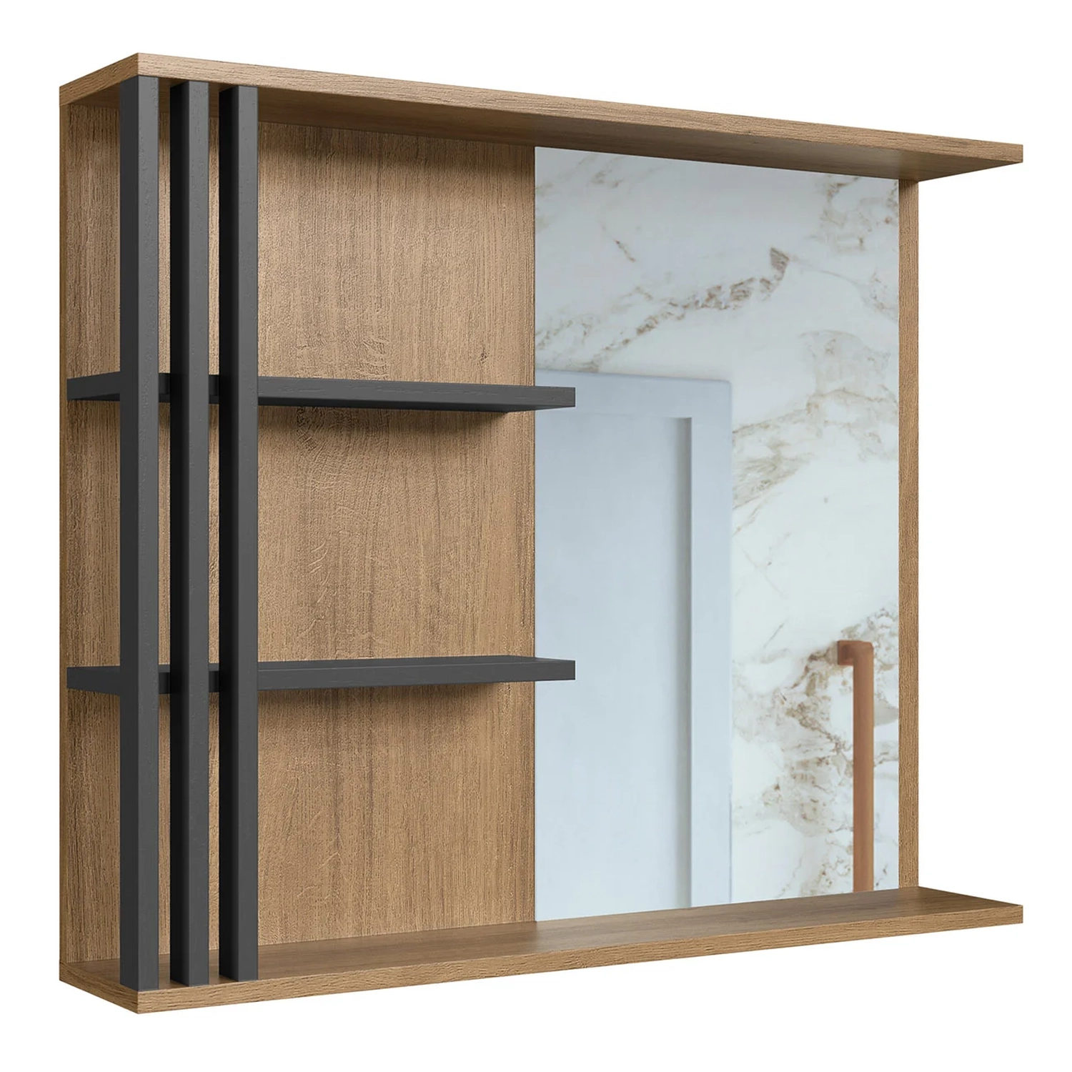 A Espelheira Para Banheiro conta com duas prateleiras para acomodar itens de uso diário e detalhes ripados na lateral, que agregam um toque moderno ao design. É uma peça versátil que combina praticidade com estilo na composição do ambiente.