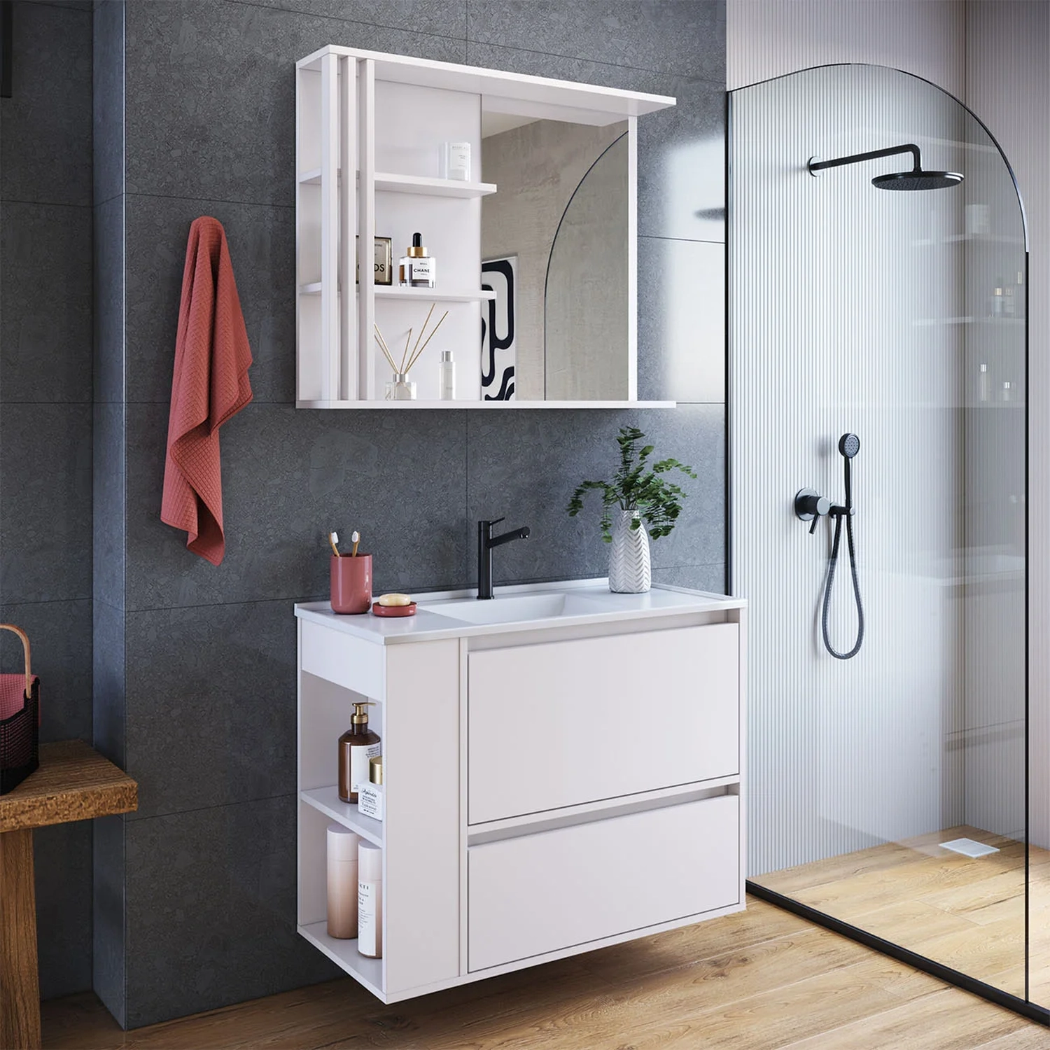 A Espelheira Para Banheiro conta com duas prateleiras para acomodar itens de uso diário e detalhes ripados na lateral, que agregam um toque moderno ao design. É uma peça versátil que combina praticidade com estilo na composição do ambiente.