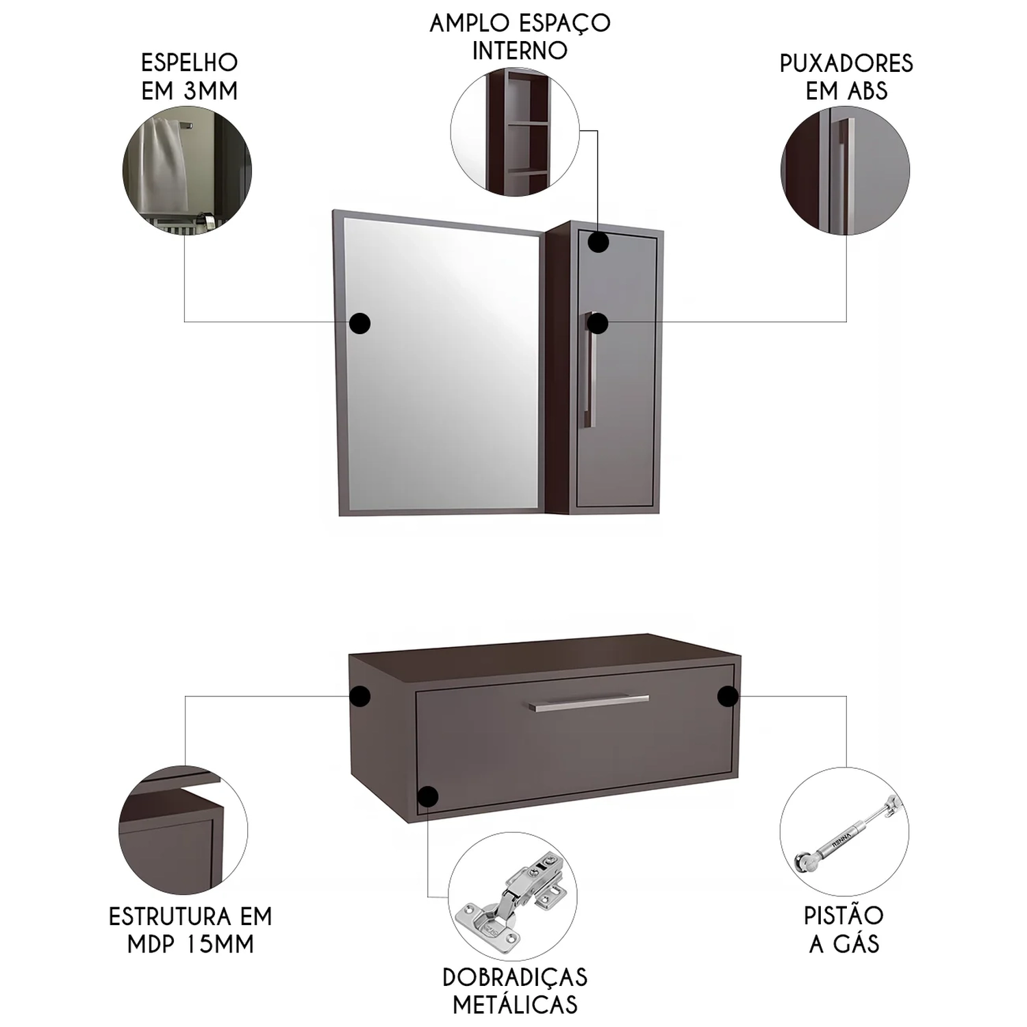 O Gabinete de Banheiro com Espelho é produzido em MDP 15mm e acompanha um armário superior com espelho de 3mm, garantindo resistência e durabilidade.
