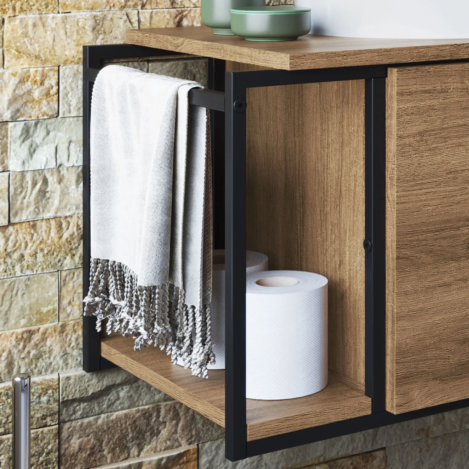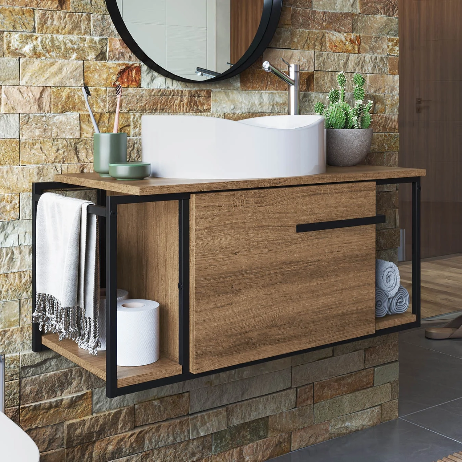 Um Gabinete Para Banheiro que une sofisticação e praticidade, com um design industrial a estrutura em MDP e metal, sua porta, tampo e nichos garantem resistência e durabilidade.