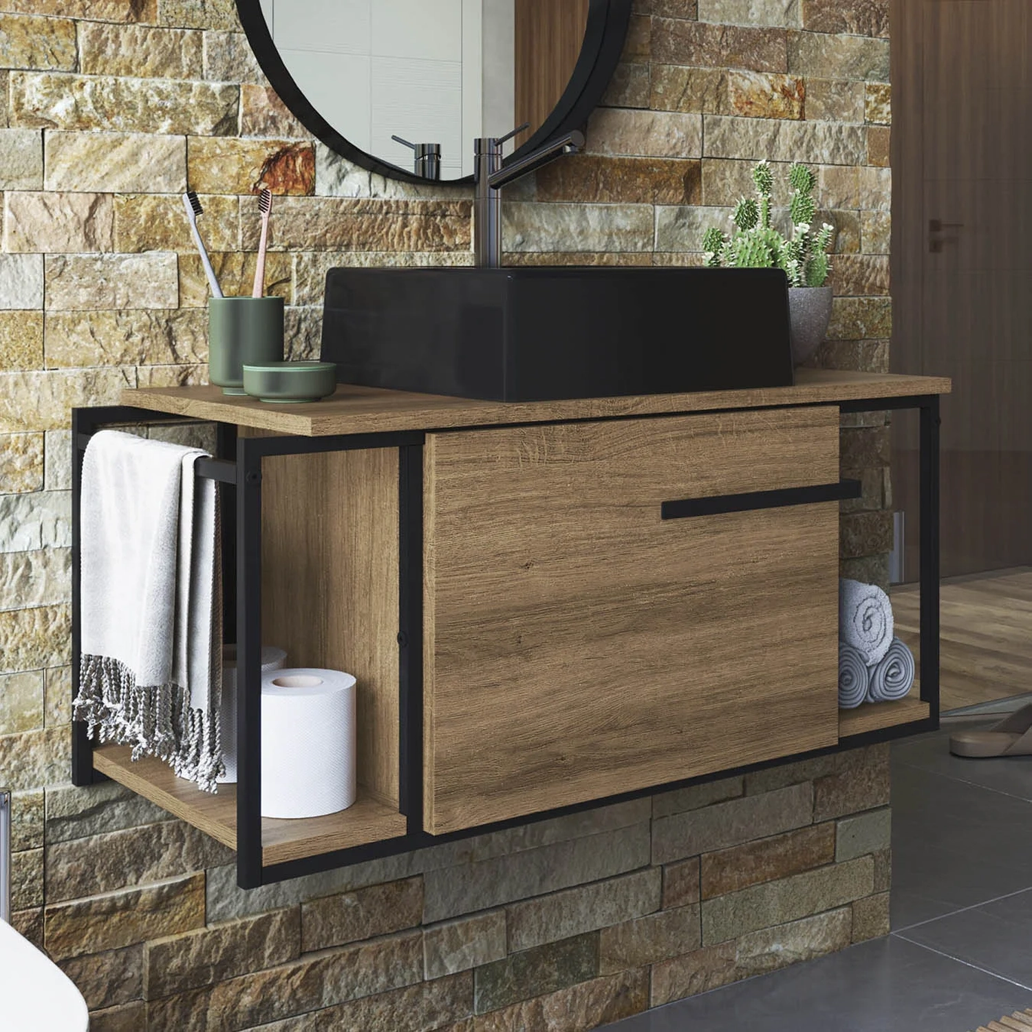 Um Gabinete Para Banheiro que une sofisticação e praticidade, com um design industrial a estrutura em MDP e metal, sua porta, tampo e nichos garantem resistência e durabilidade.