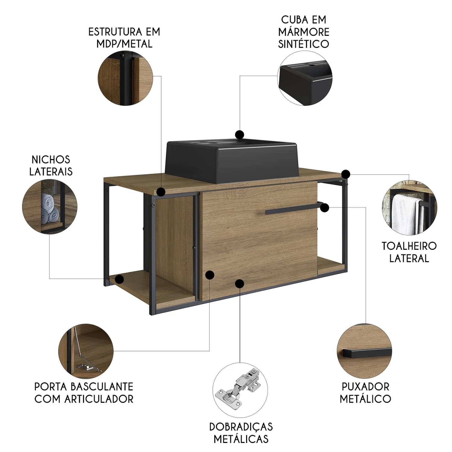 Gabinete Banheiro Suspenso 80cm Cuba Quadrada Ripy Mel/Preto Z54 - Mpozenato