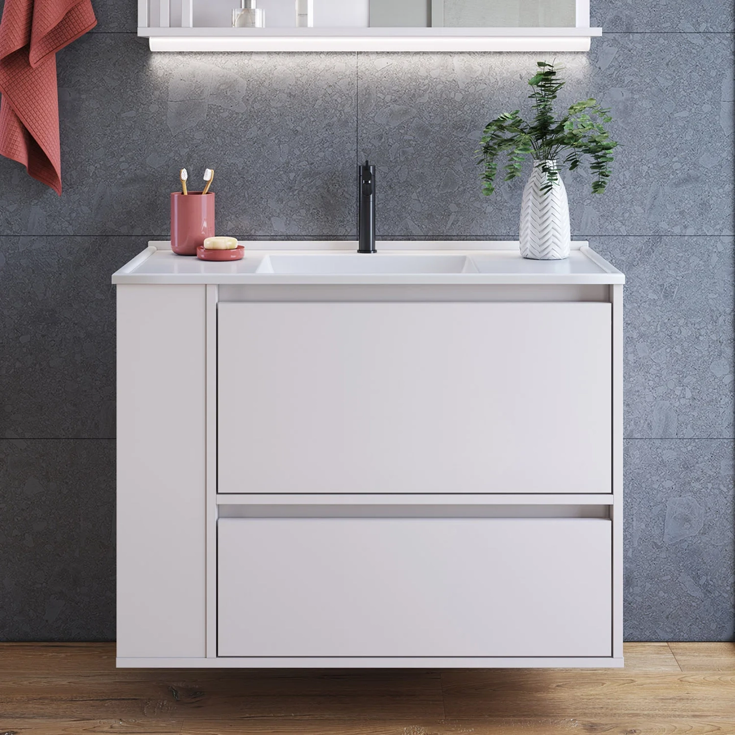 O Gabinete de Banheiro possui estrutura em MDP de 15mm e design inteligente do tipo flex, permitindo a montagem com abertura para a direita ou esquerda. Essa versatilidade facilita a adaptação em diferentes layouts de banheiro.