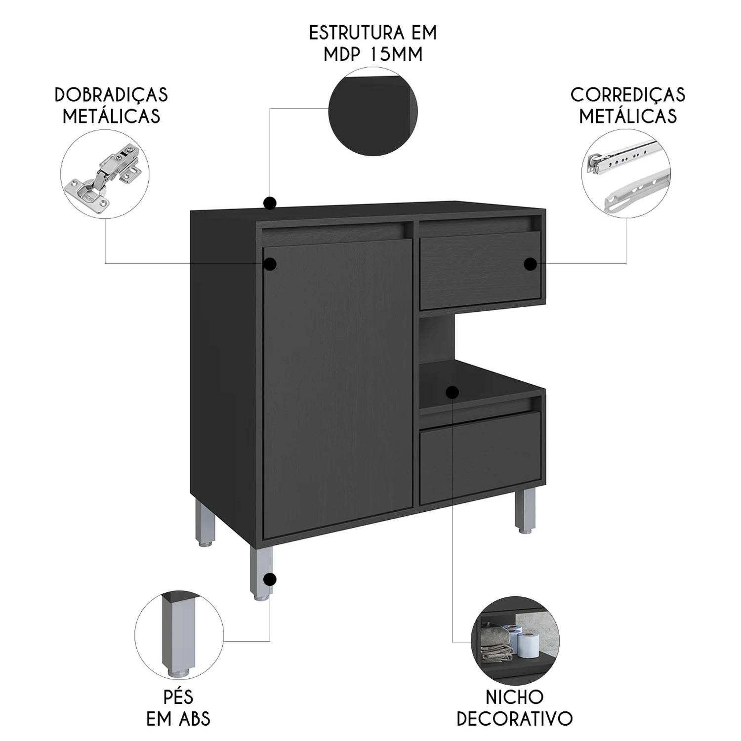 Este Armário de Banheiro possui uma composição completa, contando com uma porta com prateleira interna bem distribuída, duas gavetas funcionais e um nicho decorativo.