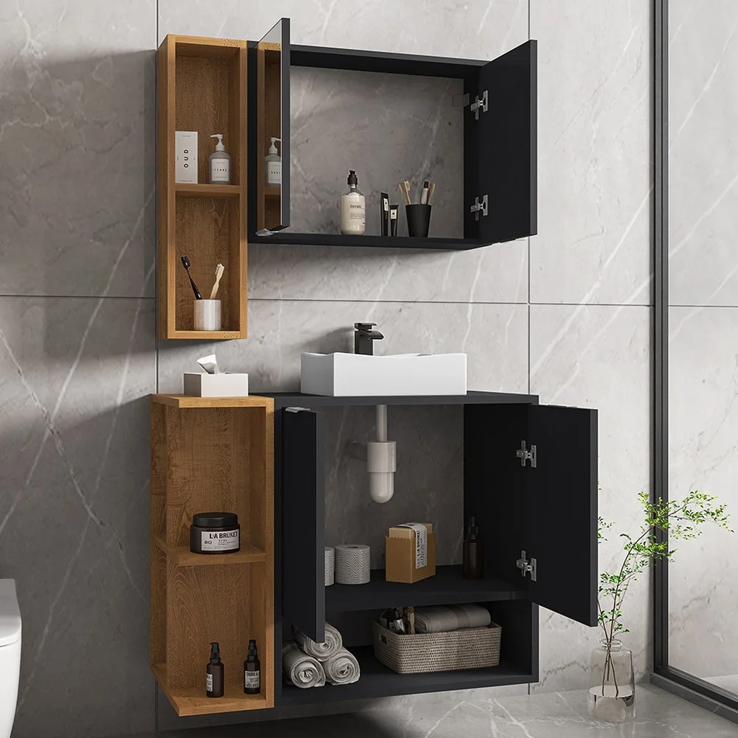 Perfeito para quem quer um banheiro completo, o conjunto de Gabinete de Banheiro com Cuba e Espelheira Lizzi B02 Preto Fosco/Naturalle, da Mpozenato, vai elevar a decoração desse ambiente com beleza e funcionalidade.