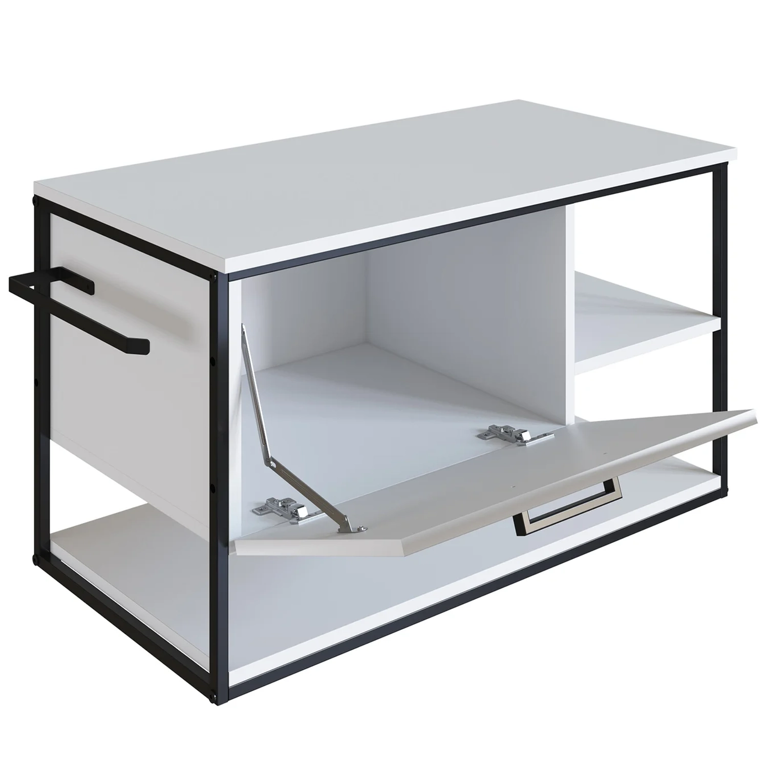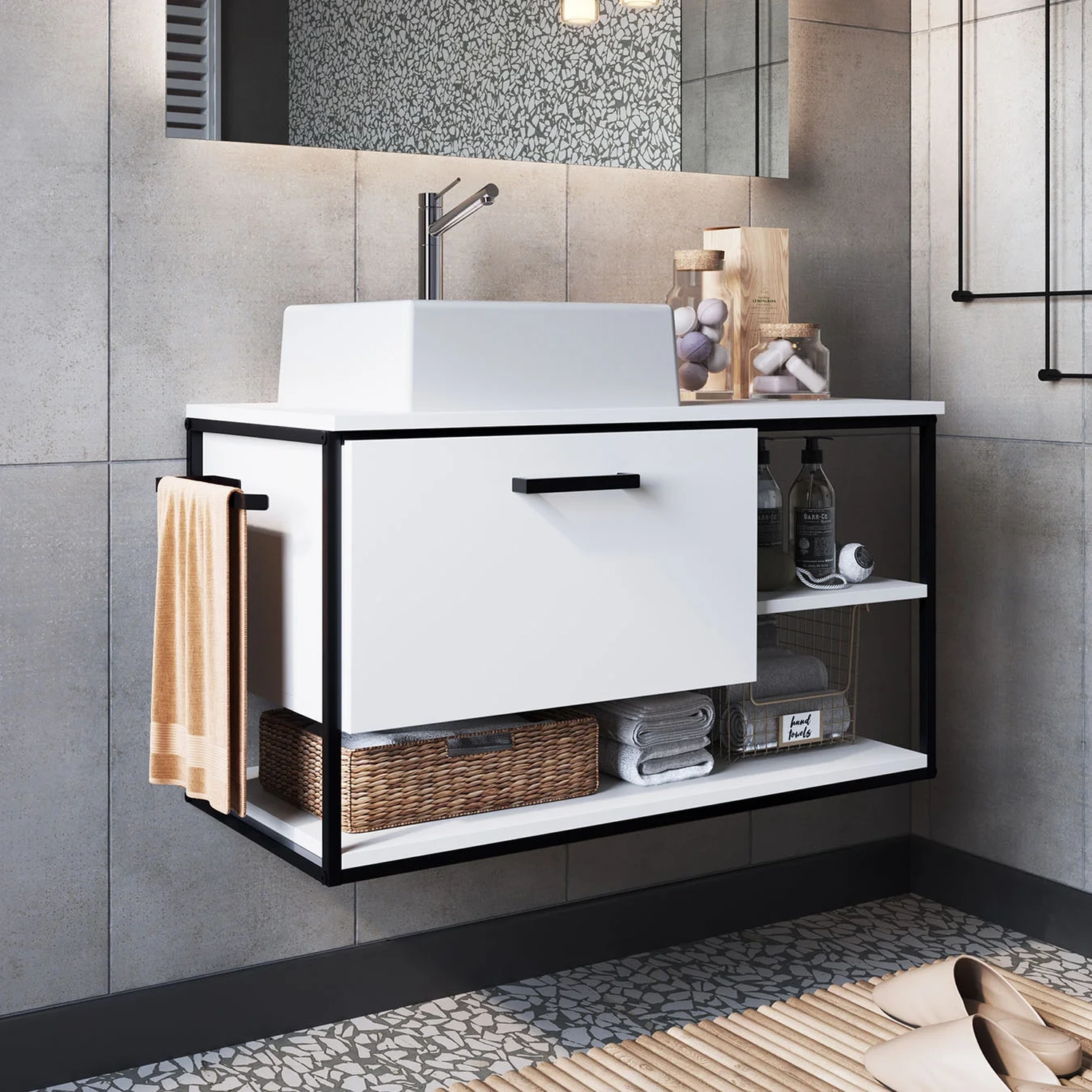 Acompanha uma cuba que agrega qualidade e praticidade além de um funcional porta toalhas integrado na lateral, sua porta basculante e dobradiças metálicas, entrega o que é necessário para manter o espaço sempre bem-arrumado.