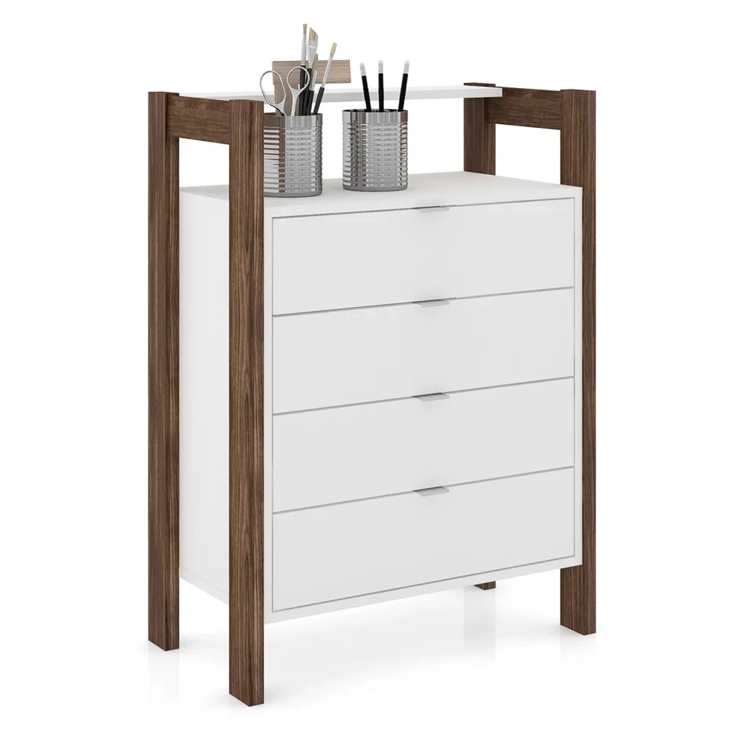 O Gaveteiro 4 Gavetas AZ1012 Branco/Nogal - Tecno Mobili é um móvel moderno e vai valorizar a decoração do ambiente. Feito em MDP 15 mm com perfeito acabamento em BP que garante maior durabilidade e resistência do produto. Além disso, conta com corrediças metálicas, puxadores em alumínio escovado e gavetas espaçosas. Aproveite e leve já!