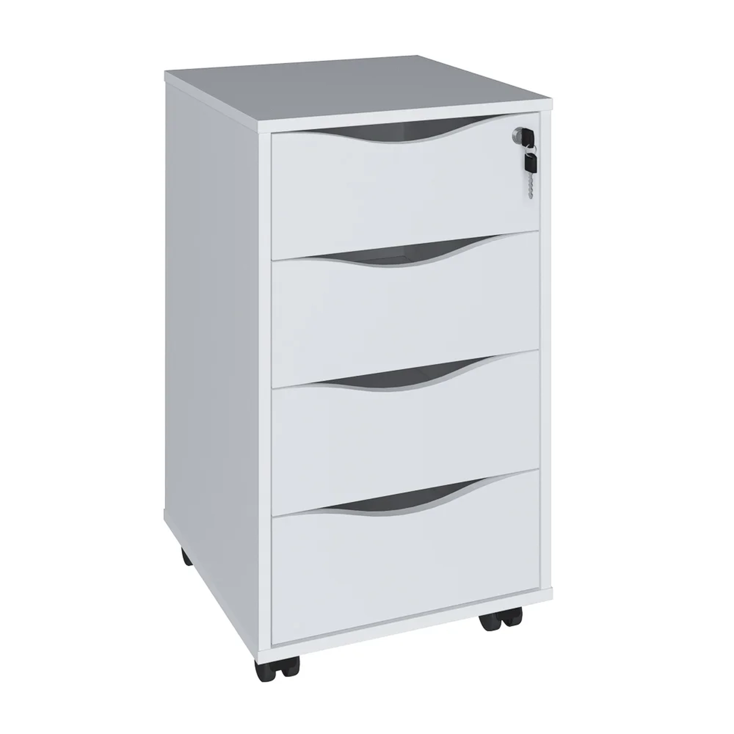 Já as 4 gavetas com corrediças metálicas e fechadura frontal proporcionam mais organização dos papéis, documentos e outros itens importantes que precisam estar sempre à mão. Sem contar que o tampo ainda pode servir de apoio para o celular, itens decorativos ou até mesmo para aquele cafezinho rápido. Ah, não podemos esquecer dos pés rodízio que deixa a locomoção mais simplificada, seja apenas para mudá-lo de lugar ou na hora da faxina.