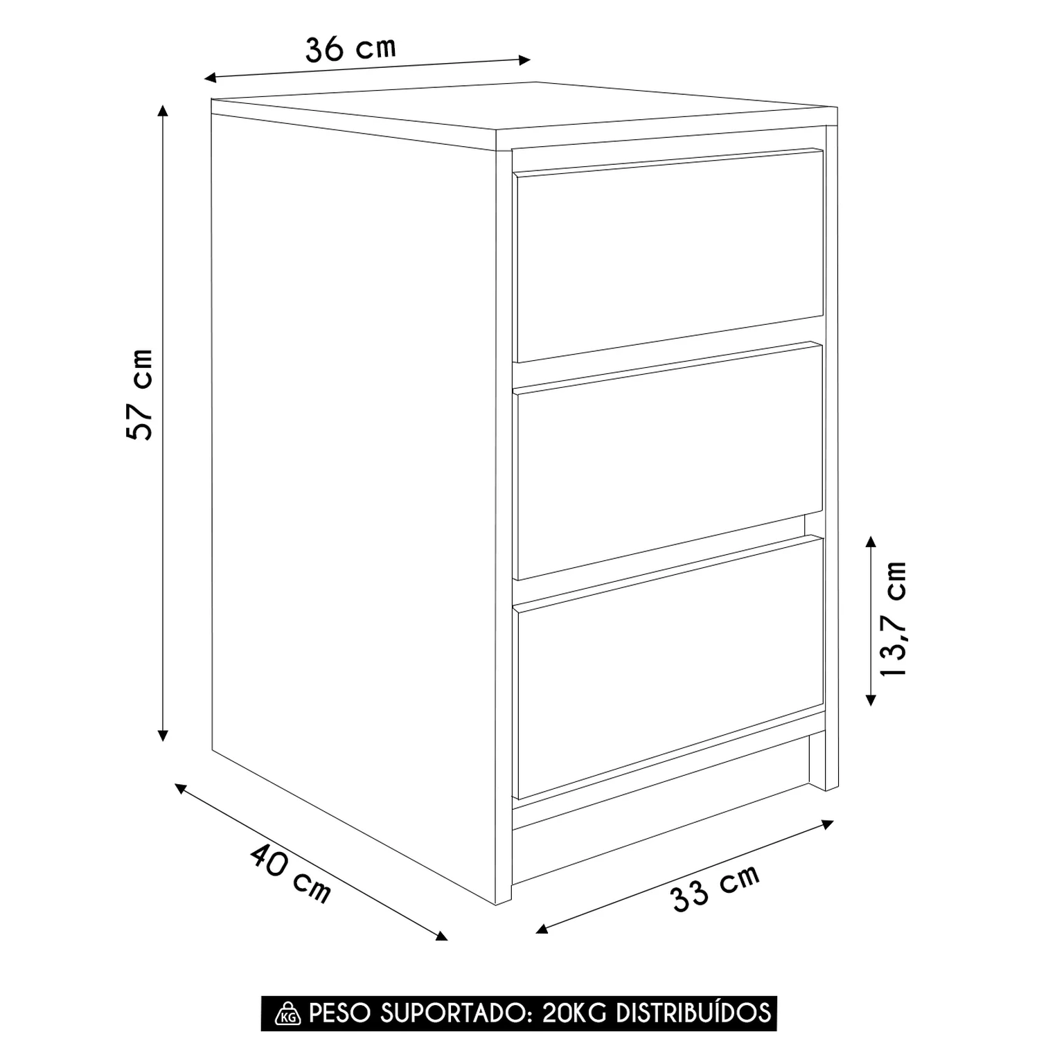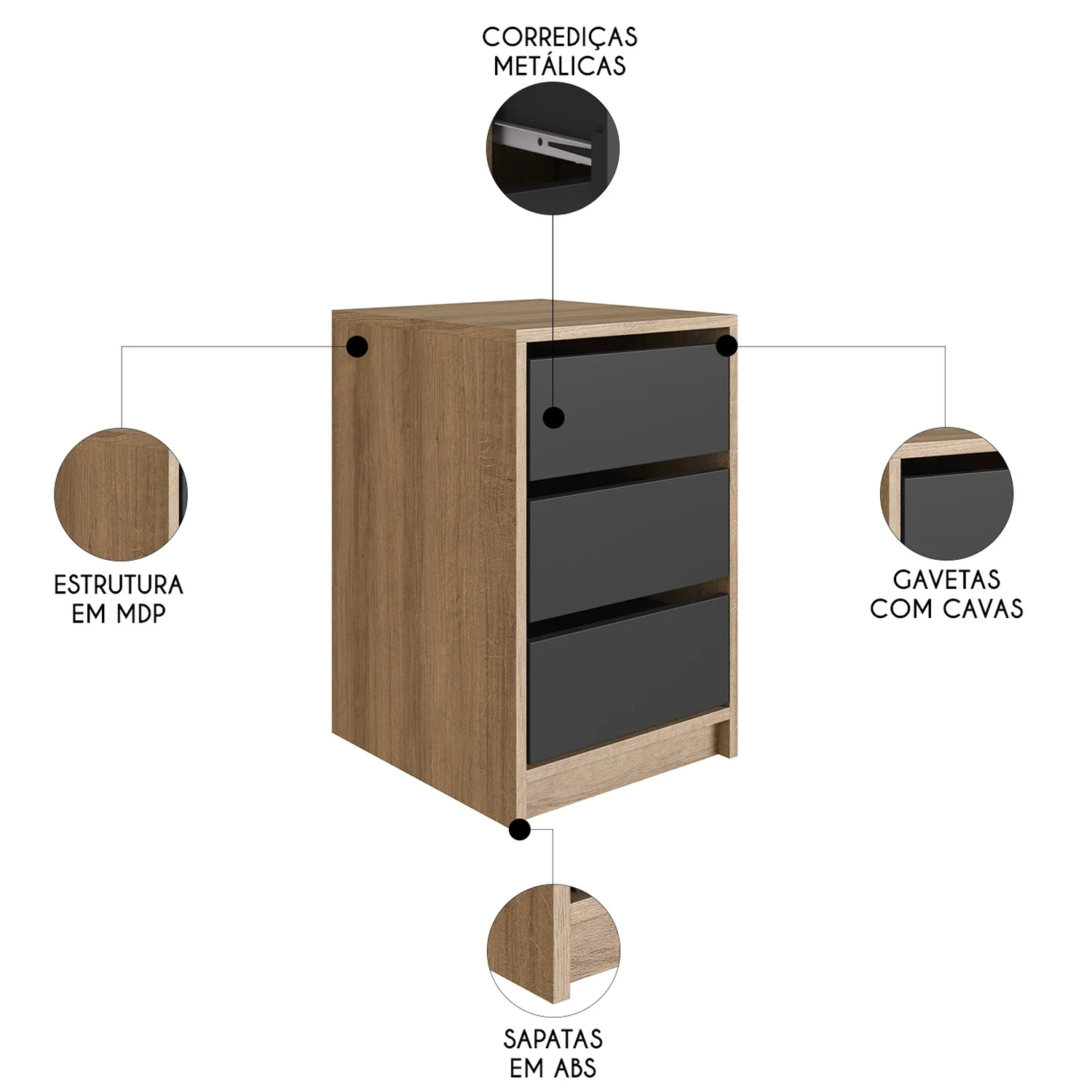 Com três gavetas amplas com corrediças metálicas que garantem durabilidade e suavidade na abertura, sua estrutura foi pensada para proporcionar o melhor aproveitamento interno.