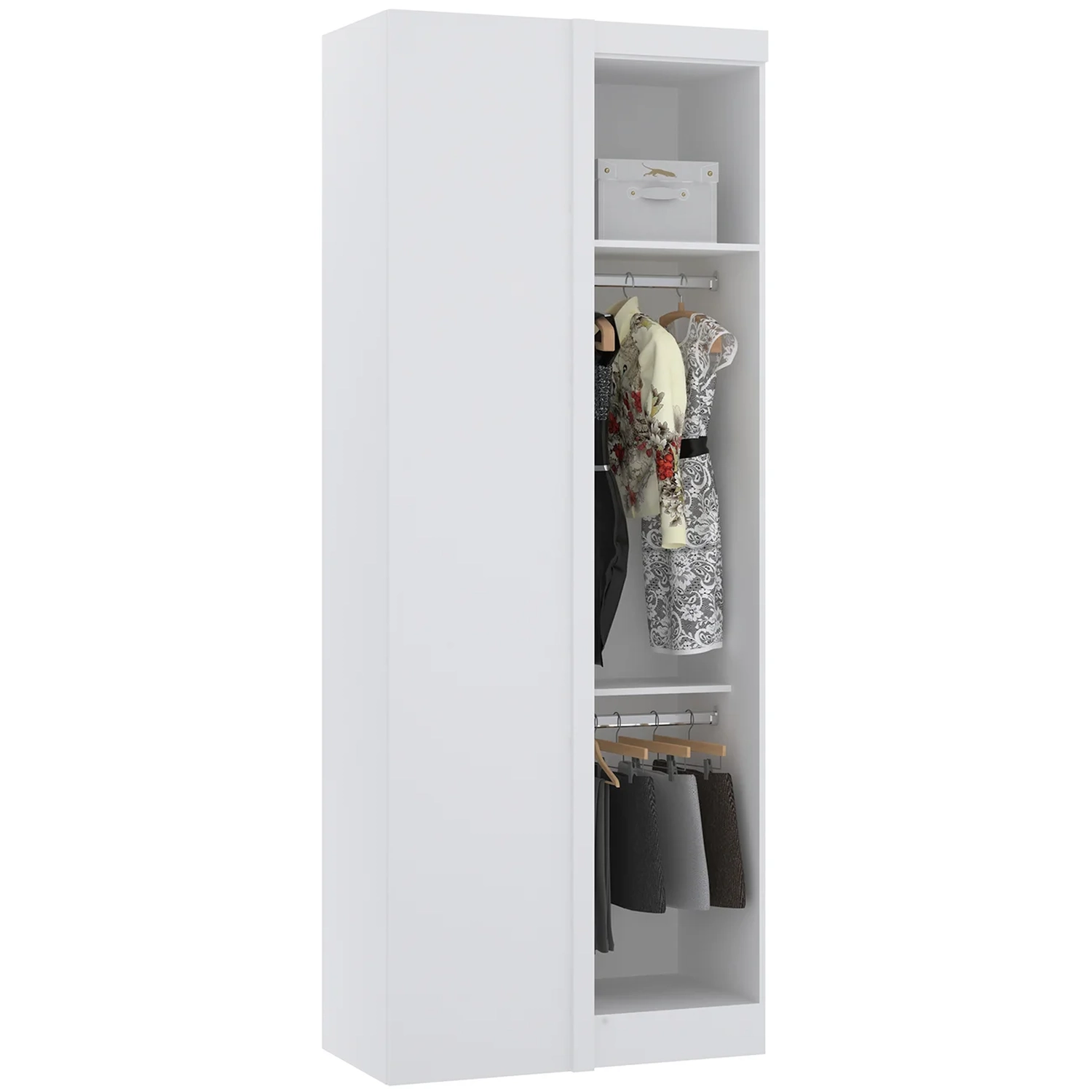 Com uma porta equipada com dobradiças metálicas e puxador em polímero sua estrutura interna surpreende com dois cabideiros e duas prateleiras espaçosas, permitindo guardar roupas e calçados com facilidade.