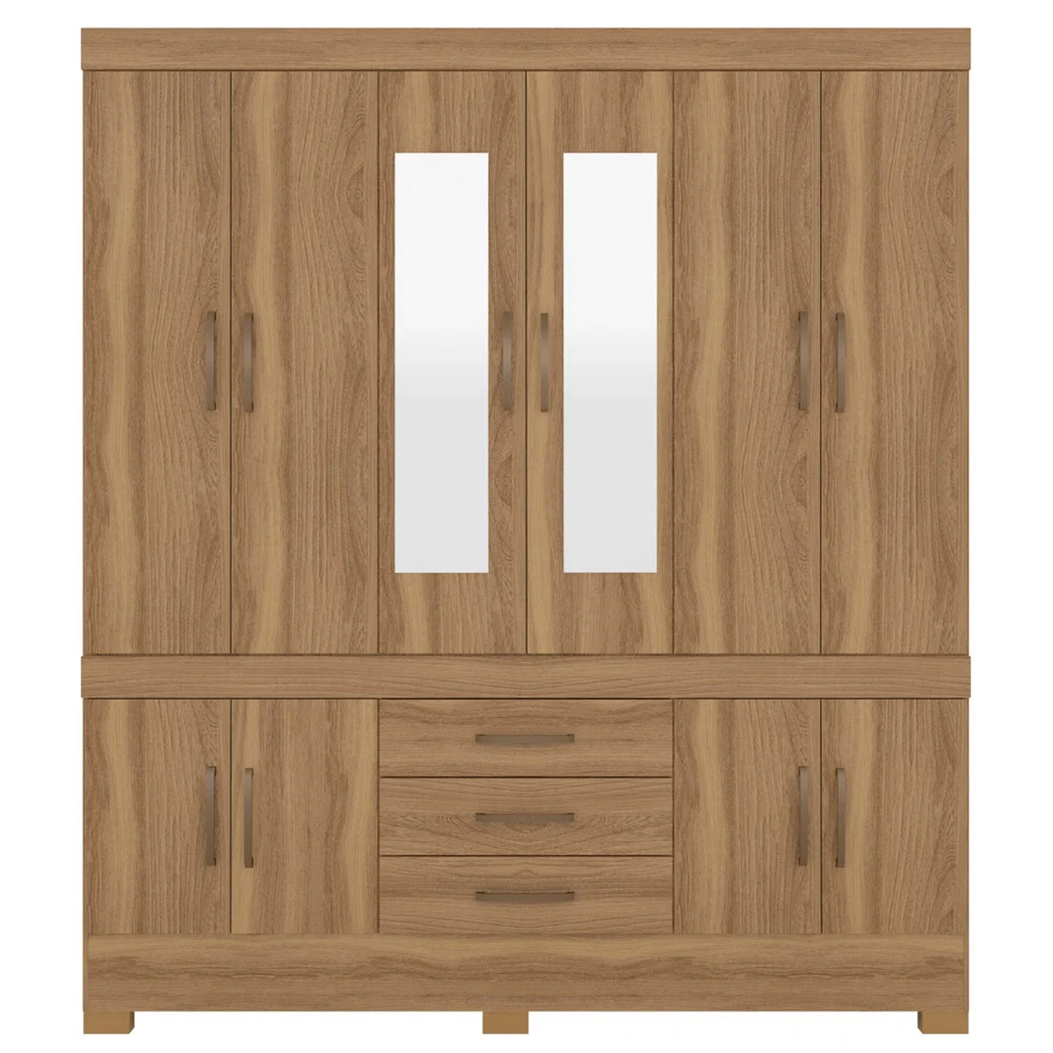 Roupeiro com divisões bem distribuídos oferecendo compartimentos exclusivos para vários pares de sapatos, maleiro espaçoso, 2 prateleiras, 3 gavetas e 2 cabideiros, para facilitar possui 10 portas com abertura convencional, para dar aquele toque especial as 2 portas centrais vem com um belo espelho.