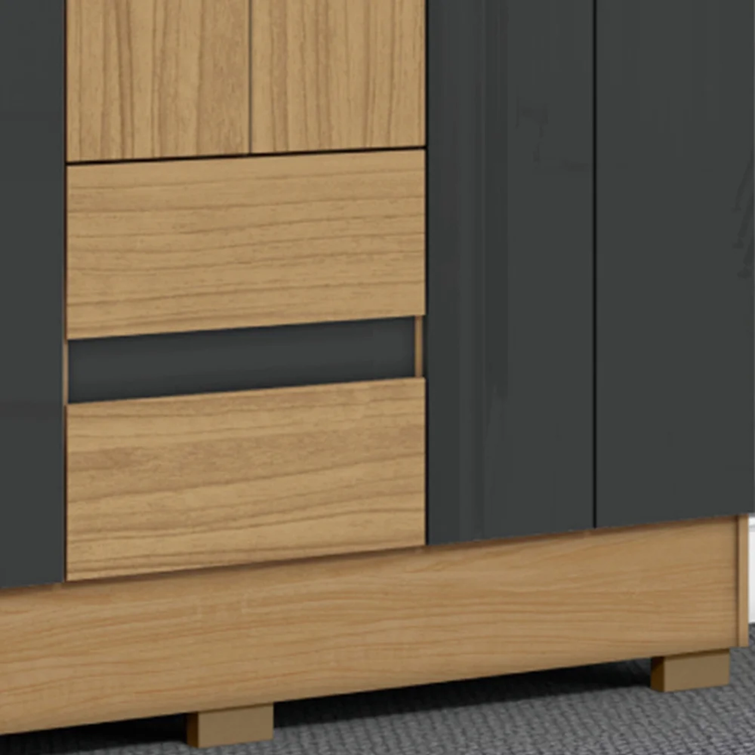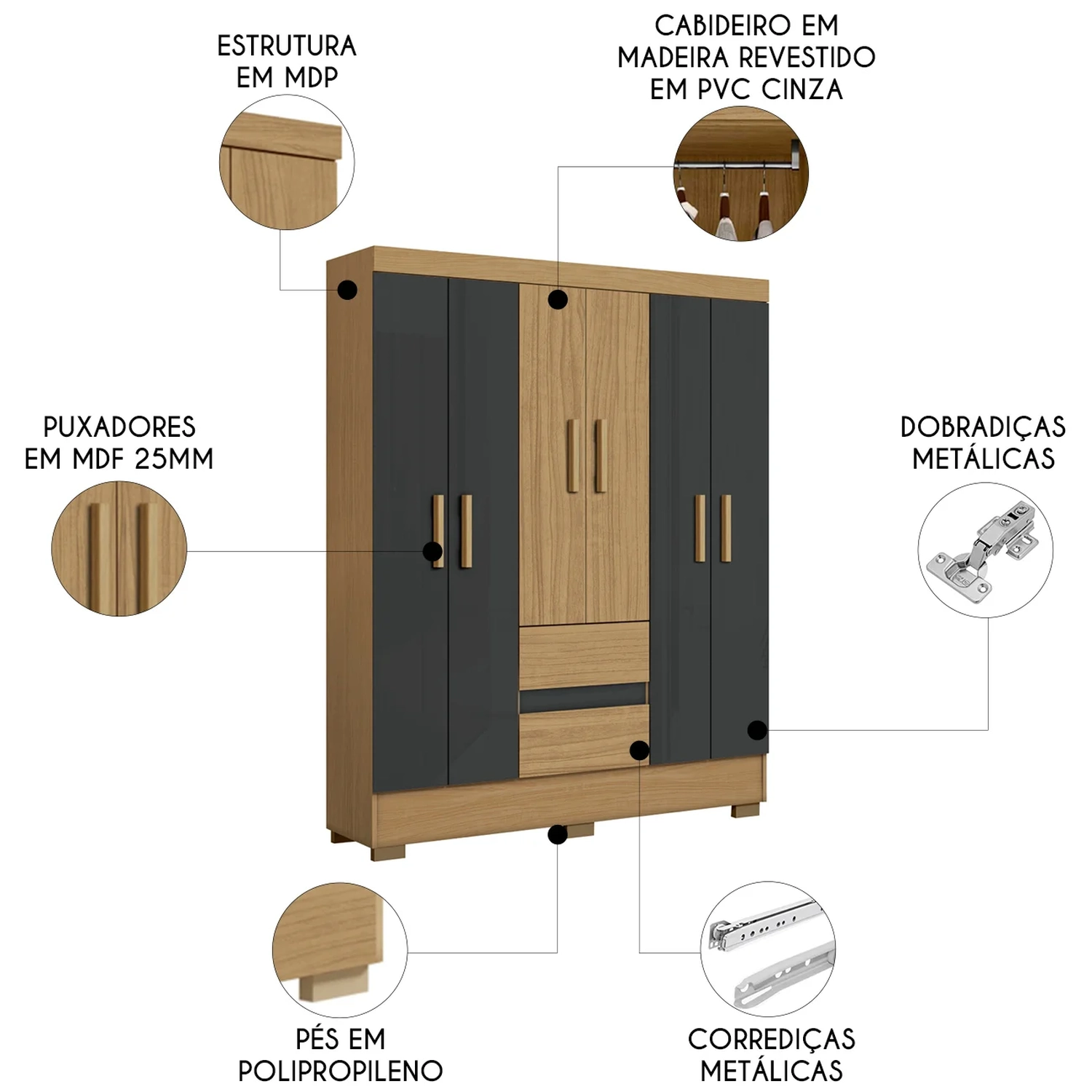 Os puxadores são em MDF 25mm, combinando robustez com um visual moderno. Os pés em polipropileno oferecem firmeza, proteção e robustez ao Guarda Roupa Grande.